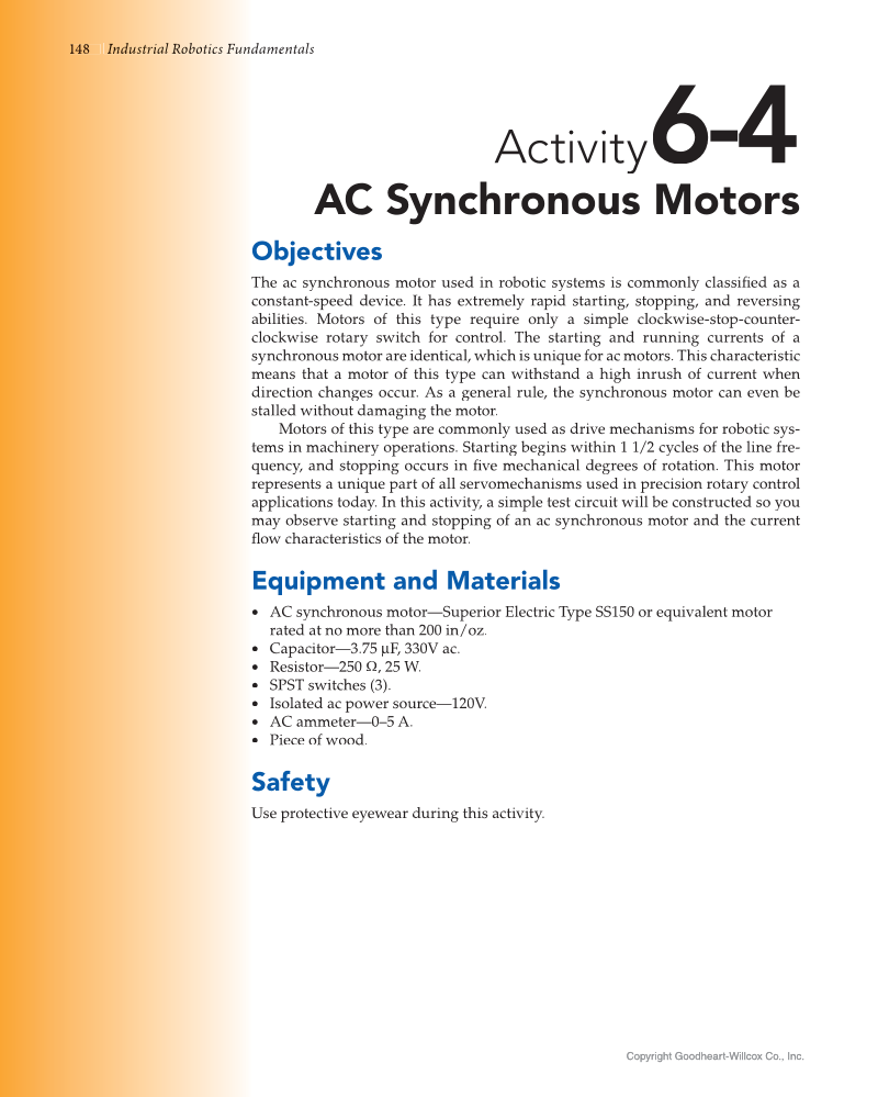 148 8 Industri I d d s ia l l Rob o bo tics i s Fu un ddamentals Copyright Goodheart-Willcox Co., Inc. Copyright Goodheart-Willcox Co., Inc. Activity 6 -4 AC Synchronous Motors Objectives The ac synchronous motor used in robotic systems is commonly classified as a fi constant-speed device. It has extremely rapid starting, stopping, and reversing abilities. Motors of this type require only a simple clockwise-stop-counter- clockwise rotary switch for control. The starting and running currents of a synchronous motor are identical, which is unique for ac motors. This characteristic means that a motor of this type can withstand a high inrush of current when direction changes occur. As a general rule, the synchronous motor can even be stalled without damaging the motor. Motors of this type are commonly used as drive mechanisms for robotic sys- tems in machinery operations. Starting begins within 1 1/2 cycles of the line fre- quency, and stopping occurs in fi ve mechanical degrees of rotation. This motor fi represents a unique part of all servomechanisms used in precision rotary control applications today. In this activity, a simple test circuit will be constructed so you may observe starting and stopping of an ac synchronous motor and the current fl ow characteristics of the motor. fl Equipment and Materials • AC synchronous motor—Superior Electric Type SS150 or equivalent motor rated at no more than 200 in/oz. • Capacitor—3.75 μF, 330V ac. • Resistor—250 Ω, 25 W. • SPST switches (3). • Isolated ac power source—120V. • AC ammeter—0–5 A. • Piece of wood. Safety Use protective eyewear during this activity.
