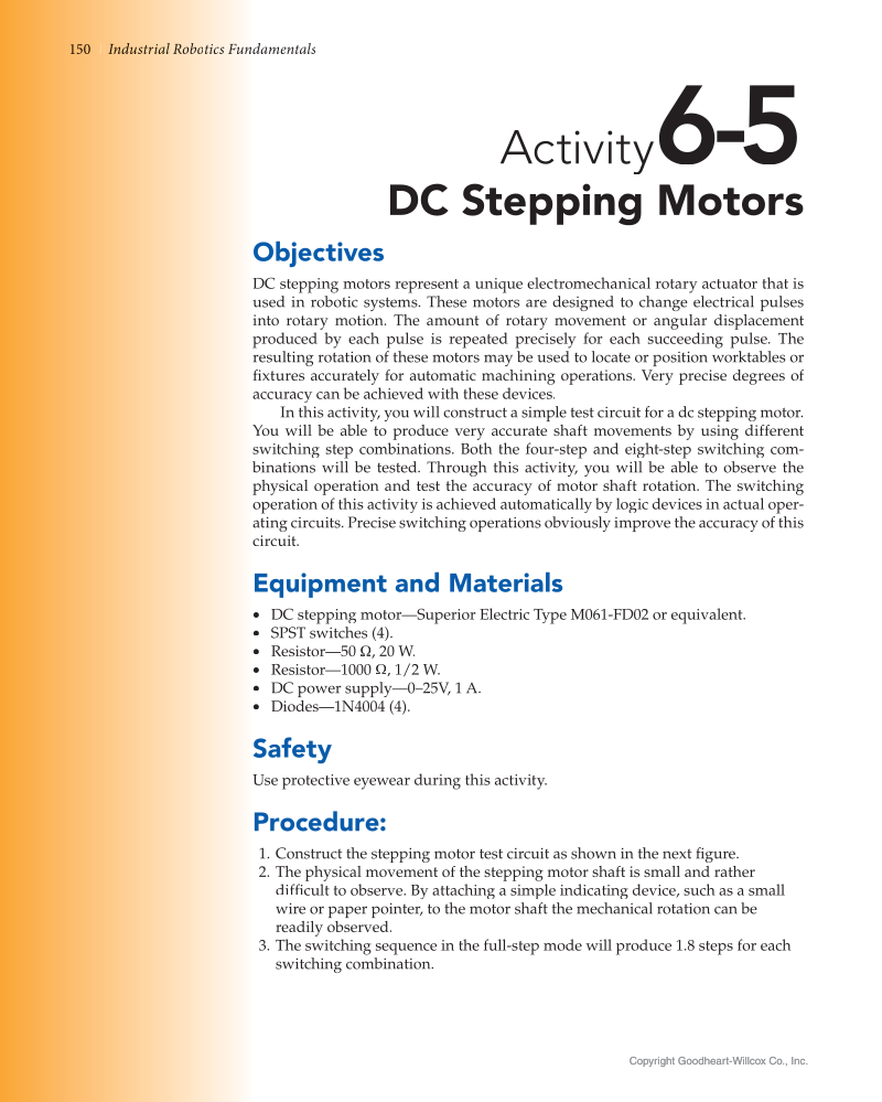 150 damentals Industri I d d s ia l l Rob bo tics s Fu un Copyright Goodheart-Willcox Co., Inc. Copyright Goodheart-Willcox Co., Inc. Activity 6 -5 DC Stepping Motors Objectives DC stepping motors represent a unique electromechanical rotary actuator that is used in robotic systems. These motors are designed to change electrical pulses into rotary motion. The amount of rotary movement or angular displacement produced by each pulse is repeated precisely for each succeeding pulse. The resulting rotation of these motors may be used to locate or position worktables or fi xtures accurately for automatic machining operations. Very precise degrees of fi accuracy can be achieved with these devices. In this activity, you will construct a simple test circuit for a dc stepping motor. You will be able to produce very accurate shaft movements by using different switching step combinations. Both the four-step and eight-step switching com- binations will be tested. Through this activity, you will be able to observe the b physical operation and test the accuracy of motor shaft rotation. The switching operation of this activity is achieved automatically by logic devices in actual oper- ating circuits. Precise switching operations obviously improve the accuracy of this circuit. Equipment and Materials • DC stepping motor—Superior Electric Type M061-FD02 or equivalent. • SPST switches (4). • Resistor—50 Ω, 20 W. • Resistor—1000 Ω, 1/2 W. • DC power supply—0–25V, 1 A. • Diodes—1N4004 (4). Safety Use protective eyewear during this activity. Procedure: 1. Construct the stepping motor test circuit as shown in the next fi gure. fi 2. The physical movement of the stepping motor shaft is small and rather diffi to observe. By attaching a simple indicating device, such as a small ficult wire or paper pointer, to the motor shaft the mechanical rotation can be readily observed. 3. The switching sequence in the full-step mode will produce 1.8 steps for each switching combination.