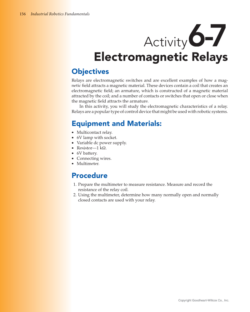 156 damentals Industri I d d s ia l l Rob bo tics s Fu un Copyright Goodheart-Willcox Co., Inc. Copyright Goodheart-Willcox Co., Inc. Activity 67- Electromagnetic Relays Objectives Relays are electromagnetic switches and are excellent examples of how a mag- netic fi eld attracts a magnetic material. These devices contain a coil that creates an fi electromagnetic fi eld an armature, which is constructed of a magnetic material fi attracted by the coil and a number of contacts or switches that open or close when the magnetic field attracts the armature. fi In this activity, you will study the electromagnetic characteristics of a relay. Relays are a popular type of control device that might be used with robotic systems. Equipment and Materials: • Multicontact relay. • 6V lamp with socket. • Variable dc power supply. • Resistor—1 kΩ. • 6V battery. • Connecting wires. • Multimeter. Procedure 1. Prepare the multimeter to measure resistance. Measure and record the resistance of the relay coil. 2. Using the multimeter, determine how many normally open and normally closed contacts are used with your relay.