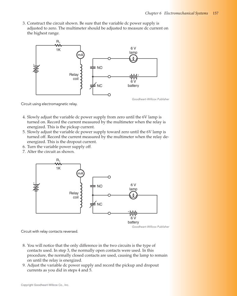 Chapter 6 Electromechan e r m m c a a ni cal a S Sy s st ems e s 157 7 Copyright Goodheart-Willcox Co., Inc. Copyright Goodheart-Willcox Co., Inc. 3. Construct the circuit shown. Be sure that the variable dc power supply is adjusted to zero. The multimeter should be adjusted to measure dc current on the highest range. 4. Slowly adjust the variable dc power supply from zero until the 6V lamp is turned on. Record the current measured by the multimeter when the relay is energized. This is the pickup current. 5. Slowly adjust the variable dc power supply toward zero until the 6V lamp is turned off. Record the current measured by the multimeter when the relay de- energized. This is the dropout current. 6. Turn the variable power supply off. 7. Alter the circuit as shown. 8. You will notice that the only difference in the two circuits is the type of contacts used. In step 3, the normally open contacts were used. In this procedure, the normally closed contacts are used, causing the lamp to remain on until the relay is energized. 9. Adjust the variable dc power supply and record the pickup and dropout currents as you did in steps 4 and 5. + + NO NC 6 V lamp 6 V battery Relay coil R1 1K mA Goodheart-Willcox Publisher Circuit using electromagnetic relay. + + 6 V lamp NO NC 6 V battery Relay coil R1 1K mA Goodheart-Willcox Publisher Circuit with relay contacts reversed.