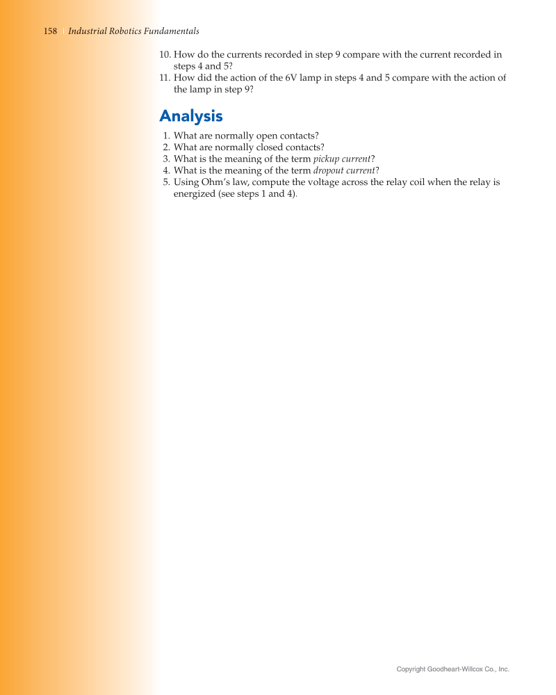 158 damentals Industri I d d s ia l l Rob bo tics s Fu un Copyright Goodheart-Willcox Co., Inc. Copyright Goodheart-Willcox Co., Inc. 10. How do the currents recorded in step 9 compare with the current recorded in steps 4 and 5? 11. How did the action of the 6V lamp in steps 4 and 5 compare with the action of the lamp in step 9? Analysis 1. What are normally open contacts? 2. What are normally closed contacts? 3. What is the meaning of the term pickup current? 4. What is the meaning of the term dropout current? 5. Using Ohm’s law, compute the voltage across the relay coil when the relay is energized (see steps 1 and 4).