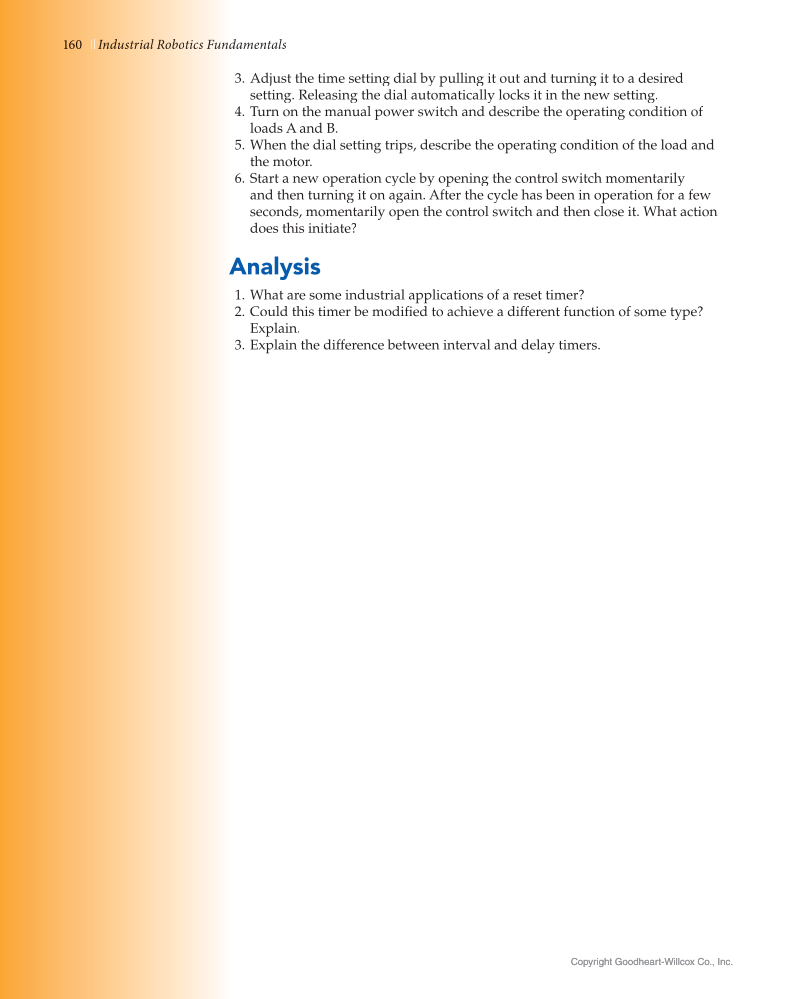 160 0 damentals Industri I d d s ia l l Rob o bo tics i s Fu un Copyright Goodheart-Willcox Co., Inc. Copyright Goodheart-Willcox Co., Inc. 3. Adjust the time setting dial by pulling it out and turning it to a desired setting. Releasing the dial automatically locks it in the new setting. 4. Turn on the manual power switch and describe the operating condition of loads A and B. 5. When the dial setting trips, describe the operating condition of the load and the motor. 6. Start a new operation cycle by opening the control switch momentarily and then turning it on again. After the cycle has been in operation for a few seconds, momentarily open the control switch and then close it. What action does this initiate? Analysis 1. What are some industrial applications of a reset timer? 2. Could this timer be modifi to achieve a different function of some type? fied Explain. 3. Explain the difference between interval and delay timers.