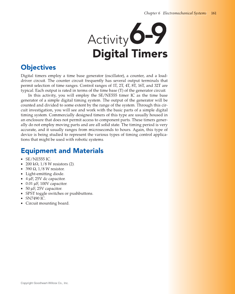 Chapter 6 Electromechan e r m m a ni cal a S Sy s st e e em s s 161 Copyright Goodheart-Willcox Co., Inc. Copyright Goodheart-Willcox Co., Inc. Activity 6-9 Digital Timers Objectives Digital timers employ a time base generator (oscillator), a counter, and a load- driver circuit. The counter circuit frequently has several output terminals that permit selection of time ranges. Control ranges of 1T, 2T, 4T, 8T, 16T, and 32T are typical. Each output is rated in terms of the time base (T) of the generator circuit. In this activity, you will employ the SE/NE555 timer IC as the time base generator of a simple digital timing system. The output of the generator will be counted and divided to some extent by the range of the system. Through this cir- cuit investigation, you will see and work with the basic parts of a simple digital timing system. Commercially designed timers of this type are usually housed in an enclosure that does not permit access to component parts. These timers gener- ally do not employ moving parts and are all solid state. The timing period is very accurate, and it usually ranges from microseconds to hours. Again, this type of f device is being studied to represent the various types of timing control applica- tions that might be used with robotic systems. Equipment and Materials • SE/NE555 IC. • 200 kΩ, 1/8 W resistors (2). • 390 Ω, 1/8 W resistor. • Light-emitting diode. • 4 μF, 25V dc capacitor. • 0.01 μF, 100V capacitor. • 50 μF, 25V capacitor. • SPST toggle switches or pushbuttons. • SN7490 IC. • Circuit mounting board.