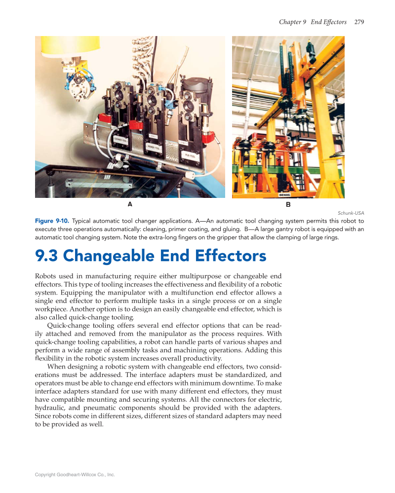 Chapter 9 End Effectors ff ff 279 Copyright Goodheart-Willcox Co., Inc. 9.3 Changeable End Effectors Robots used in manufacturing require either multipurpose or changeable end effectors. This type of tooling increases the effectiveness and fl exibility of a robotic fl system. Equipping the manipulator with a multifunction end effector allows a single end effector to perform multiple tasks in a single process or on a single workpiece. Another option is to design an easily changeable end effector, which is also called quick-change tooling. Quick-change tooling offers several end effector options that can be read- ily attached and removed from the manipulator as the process requires. With quick-change tooling capabilities, a robot can handle parts of various shapes and perform a wide range of assembly tasks and machining operations. Adding this flexibility in the robotic system increases overall productivity. fl When designing a robotic system with changeable end effectors, two consid- erations must be addressed. The interface adapters must be standardized, and operators must be able to change end effectors with minimum downtime. To make interface adapters standard for use with many different end effectors, they must have compatible mounting and securing systems. All the connectors for electric, hydraulic, and pneumatic components should be provided with the adapters. Since robots come in different sizes, different sizes of standard adapters may need to be provided as well. A B Schunk-USA Figure 9-10. Typical automatic tool changer applications. A—An automatic tool changing system permits this robot to execute three operations automatically: cleaning, primer coating, and gluing. B—A large gantry robot is equipped with an automatic tool changing system. Note the extra-long fi ngers on the gripper that allow the clamping of large rings. fi