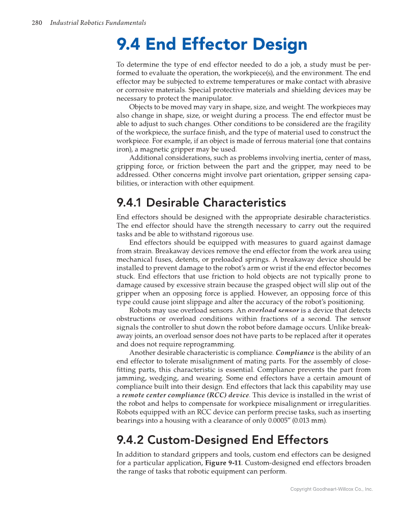 280 Industrial Robotics Fundamentals Copyright Goodheart-Willcox Co., Inc. 9.4 End Effector Design To determine the type of end effector needed to do a job, a study must be per- formed to evaluate the operation, the workpiece(s), and the environment. The end effector may be subjected to extreme temperatures or make contact with abrasive or corrosive materials. Special protective materials and shielding devices may be necessary to protect the manipulator. Objects to be moved may vary in shape, size, and weight. The workpieces may also change in shape, size, or weight during a process. The end effector must be able to adjust to such changes. Other conditions to be considered are the fragility of the workpiece, the surface fi nish, and the type of material used to construct the fi workpiece. For example, if an object is made of ferrous material (one that contains iron), a magnetic gripper may be used. Additional considerations, such as problems involving inertia, center of mass, gripping force, or friction between the part and the gripper, may need to be addressed. Other concerns might involve part orientation, gripper sensing capa- bilities, or interaction with other equipment. 9.4.1 Desirable Characteristics End effectors should be designed with the appropriate desirable characteristics. The end effector should have the strength necessary to carry out the required tasks and be able to withstand rigorous use. End effectors should be equipped with measures to guard against damage from strain. Breakaway devices remove the end effector from the work area using mechanical fuses, detents, or preloaded springs. A breakaway device should be installed to prevent damage to the robot’s arm or wrist if the end effector becomes stuck. End effectors that use friction to hold objects are not typically prone to damage caused by excessive strain because the grasped object will slip out of the gripper when an opposing force is applied. However, an opposing force of this type could cause joint slippage and alter the accuracy of the robot’s positioning. Robots may use overload sensors. An overload sensor is a device that detects r obstructions or overload conditions within fractions of a second. The sensor signals the controller to shut down the robot before damage occurs. Unlike break- away joints, an overload sensor does not have parts to be replaced after it operates and does not require reprogramming. Another desirable characteristic is compliance. Compliance is the ability of an end effector to tolerate misalignment of mating parts. For the assembly of close- fi tting parts, this characteristic is essential. Compliance prevents the part from fi jamming, wedging, and wearing. Some end effectors have a certain amount of compliance built into their design. End effectors that lack this capability may use a remote center compliance (RCC) device. This device is installed in the wrist of the robot and helps to compensate for workpiece misalignment or irregularities. Robots equipped with an RCC device can perform precise tasks, such as inserting bearings into a housing with a clearance of only 0.0005″ (0.013 mm). ″ 9.4.2 Custom-Designed End Effectors In addition to standard grippers and tools, custom end effectors can be designed for a particular application, Figure 9-11. Custom-designed end effectors broaden the range of tasks that robotic equipment can perform.