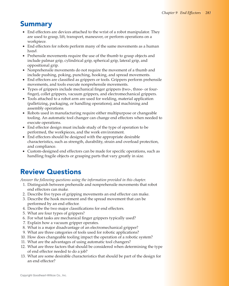 C Ch a ap ter t 9 E En d d Effecto Eff Eff e t or s s ff 283 Copyright Goodheart-Willcox Co., Inc. Copyright Goodheart-Willcox Co., Inc. Summary • End effectors are devices attached to the wrist of a robot manipulator. They are used to grasp, lift, transport, maneuver, or perform operations on a workpiece. • End effectors for robots perform many of the same movements as a human hand. • Prehensile movements require the use of the thumb to grasp objects and include palmar grip, cylindrical grip, spherical grip, lateral grip, and oppositional grip. • Nonprehensile movements do not require the movement of a thumb and include pushing, poking, punching, hooking, and spread movements. • End effectors are classifi as grippers or tools. Grippers perform prehensile fied movements, and tools execute nonprehensile movements. • Types of grippers include mechanical fi nger grippers (two-, three- or four- fi fi nger), collet grippers, vacuum grippers, and electromechanical grippers. fi • Tools attached to a robot arm are used for welding, material application (palletizing, packaging, or handling operations), and machining and assembly operations. • Robots used in manufacturing require either multipurpose or changeable tooling. An automatic tool changer can change end effectors when needed to execute operations. • End effector design must include study of the type of operation to be performed, the workpieces, and the work environment. • End effectors should be designed with the appropriate desirable characteristics, such as strength, durability, strain and overload protection, and compliance. • Custom-designed end effectors can be made for specific operations, such as fi handling fragile objects or grasping parts that vary greatly in size. Review Questions Answer the following questions using the information provided in this chapter. 1. Distinguish between prehensile and nonprehensile movements that robot end effectors can make. 2. Describe fi ve types of gripping movements an end effector can make. fi 3. Describe the hook movement and the spread movement that can be performed by an end effector. 4. Describe the two major classifications for end effectors. fi 5. What are four types of grippers? 6. For what tasks are mechanical fi nger grippers typically used? fi 7. Explain how a vacuum gripper operates. 8. What is a major disadvantage of an electromechanical gripper? 9. What are three categories of tools used for robotic applications? 10. How does changeable tooling impact the operation of a robotic system? 11. What are the advantages of using automatic tool changers? 12. What are three factors that should be considered when determining the type of end effector needed to do a job? 13. What are some desirable characteristics that should be part of the design for an end effector?