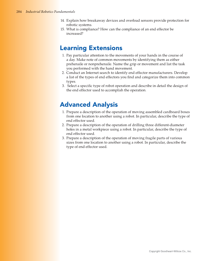 2 28 4 damentals Industri I d d s r ia l l Rob bo t ti cs s s Fu un Copyright Goodheart-Willcox Co., Inc. Copyright Goodheart-Willcox Co., Inc. 14. Explain how breakaway devices and overload sensors provide protection for robotic systems. 15. What is compliance? How can the compliance of an end effector be increased? Learning Extensions 1. Pay particular attention to the movements of your hands in the course of a day. Make note of common movements by identifying them as either prehensile or nonprehensile. Name the grip or movement and list the task you performed with the hand movement. 2. Conduct an Internet search to identify end effector manufacturers. Develop a list of the types of end effectors you fi nd and categorize them into common fi types. 3. Select a specifi type of robot operation and describe in detail the design of fic the end effector used to accomplish the operation. Advanced Analysis 1. Prepare a description of the operation of moving assembled cardboard boxes from one location to another using a robot. In particular, describe the type of end effector used. 2. Prepare a description of the operation of drilling three different-diameter holes in a metal workpiece using a robot. In particular, describe the type of end effector used. 3. Prepare a description of the operation of moving fragile parts of various sizes from one location to another using a robot. In particular, describe the type of end effector used.