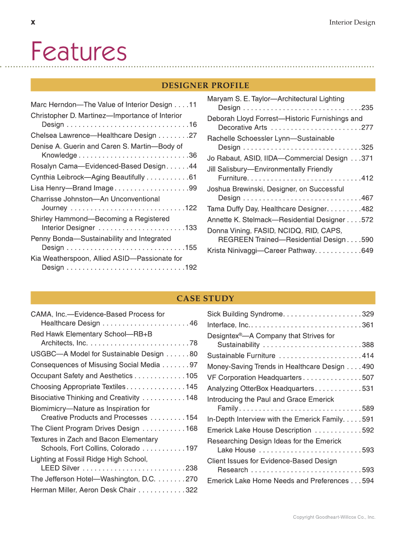 Copyright Goodheart-Willcox Co., Inc. x Interior Design Features Marc Herndon—The Value of Interior Design . . . .11 Christopher D. Martinez—Importance of Interior Design . . . . . . . . . . . . . . . . . . . . . . . . . . . . . . .16 Chelsea Lawrence—Healthcare Design . . . . . . . .27 Denise A. Guerin and Caren S. Martin—Body of Knowledge . . . . . . . . . . . . . . . . . . . . . . . . . . . .36 Rosalyn Cama—Evidenced-Based Design . . . . . .44 Cynthia Leibrock—Aging Beautifully . . . . . . . . . . .61 Lisa Henry—Brand Image . . . . . . . . . . . . . . . . . . .99 Charrisse Johnston—An Unconventional Journey . . . . . . . . . . . . . . . . . . . . . . . . . . . . .122 Shirley Hammond—Becoming a Registered Interior Designer . . . . . . . . . . . . . . . . . . . . . .133 Penny Bonda—Sustainability and Integrated Design . . . . . . . . . . . . . . . . . . . . . . . . . . . . . .155 Kia Weatherspoon, Allied ASID—Passionate for Design . . . . . . . . . . . . . . . . . . . . . . . . . . . . . .192 Maryam S. E. Taylor—Architectural Lighting Design . . . . . . . . . . . . . . . . . . . . . . . . . . . . . .235 Deborah Lloyd Forrest—Historic Furnishings and Decorative Arts . . . . . . . . . . . . . . . . . . . . . . .277 Rachelle Schoessler Lynn—Sustainable Design . . . . . . . . . . . . . . . . . . . . . . . . . . . . . .325 Jo Rabaut, ASID, IIDA—Commercial Design . . .371 Jill Salisbury—Environmentally Friendly Furniture . . . . . . . . . . . . . . . . . . . . . . . . . . . . .412 Joshua Brewinski, Designer, on Successful Design . . . . . . . . . . . . . . . . . . . . . . . . . . . . . .467 Tama Duffy Day, Healthcare Designer . . . . . . . . .482 Annette K. Stelmack—Residential Designer . . . .572 Donna Vining, FASID, NCIDQ, RID, CAPS, REGREEN Trained—Residential Design . . . .590 Krista Ninivaggi—Career Pathway. . . . . . . . . . . .649 CAMA, Inc.—Evidence-Based Process for Healthcare Design . . . . . . . . . . . . . . . . . . . . . .46 Red Hawk Elementary School—RB+B Architects, Inc. . . . . . . . . . . . . . . . . . . . . . . . . .78 USGBC—A Model for Sustainable Design . . . . . .80 Consequences of Misusing Social Media . . . . . . .97 Occupant Safety and Aesthetics . . . . . . . . . . . . .105 Choosing Appropriate Textiles . . . . . . . . . . . . . . .145 Bisociative Thinking and Creativity . . . . . . . . . . .148 Biomimicry—Nature as Inspiration for Creative Products and Processes . . . . . . . . .154 The Client Program Drives Design . . . . . . . . . . .168 Textures in Zach and Bacon Elementary Schools, Fort Collins, Colorado . . . . . . . . . . .197 Lighting at Fossil Ridge High School, LEED Silver . . . . . . . . . . . . . . . . . . . . . . . . . .238 The Jefferson Hotel—Washington, D.C. . . . . . . .270 Herman Miller, Aeron Desk Chair . . . . . . . . . . . .322 Sick Building Syndrome . . . . . . . . . . . . . . . . . . . .329 Interface, Inc. . . . . . . . . . . . . . . . . . . . . . . . . . . . .361 Designtex®—A Company that Strives for Sustainability . . . . . . . . . . . . . . . . . . . . . . . . .388 Sustainable Furniture . . . . . . . . . . . . . . . . . . . . .414 Money-Saving Trends in Healthcare Design . . . .490 VF Corporation Headquarters . . . . . . . . . . . . . . .507 Analyzing OtterBox Headquarters . . . . . . . . . . . .531 Introducing the Paul and Grace Emerick Family . . . . . . . . . . . . . . . . . . . . . . . . . . . . . . .589 In-Depth Interview with the Emerick Family . . . . .591 Emerick Lake House Description . . . . . . . . . . . .592 Researching Design Ideas for the Emerick Lake House . . . . . . . . . . . . . . . . . . . . . . . . . .593 Client Issues for Evidence-Based Design Research . . . . . . . . . . . . . . . . . . . . . . . . . . . .593 Emerick Lake Home Needs and Preferences . . .594 DESIGNER PROFILE CASE STUDY