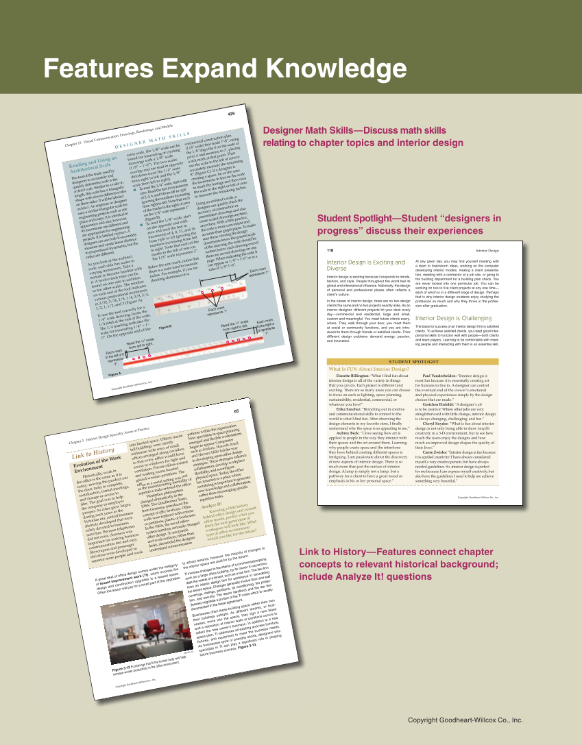 Copyright Goodheart-Willcox Co., Inc. xiv Interior Design Features Expand Knowledge Student Spotlight—Student “designers in progress” discuss their experiences Designer Math Skills—Discuss math skills relating to chapter topics and interior design Link to History—Features connect chapter concepts to relevant historical background include Analyze It! questions 118 Interior Design Copyright Goodheart-Willcox Co., Inc. Interior Design is Exciting and Diverse Interior design is exciting because it responds to trends, fashion, and style. People throughout the world feel its global and international infl uence. Nationally, the design of personal and professional places often refl ects a client’s culture. In the career of interior design, there are no two design clients the same and no two projects exactly alike. As an interior designer, different projects hit your desk every day—commercial and residential, large and small, custom and meaningful. You meet future clients every- where. They walk through your door, you meet them at social or community functions, and you are intro- duced to them through friends or satisfi ed clients. Their different design problems demand energy, passion, and innovation. At any given day, you may fi nd yourself meeting with a team to brainstorm ideas, working on the computer developing interior models, making a client presenta- tion, meeting with a contractor at a job site, or going to the building department for a building plan check. You are never locked into one particular job. You can be working on two to fi ve client projects at any one time— each of which is in a different stage of design. Perhaps that is why interior design students enjoy studying the profession so much and why they thrive in the profes- sion after graduation. Interior Design is Challenging The basis for success of an interior design fi rm is satisfi ed clients. To achieve satisfi ed clients, you need good inter- personal skills to function well with people—both clients and team players. Learning to be comfortable with meet- ing people and interacting with them is an essential skill. STUDENT SPOTLIGHT Danette Billington: “What I fi nd fun about interior design is all of the variety in things that you can do. Each project is different and exciting. There are so many areas you can choose to focus on such as lighting, space planning, sustainability, residential, commercial, or whatever you love!” Erika Sanchez: “Branching out in creative and communicational skills to connect to the world is what I fi nd fun. After observing the design elements in my favorite store, I fi nally understand why the space is so appealing to me.” Aubrey Beck: “I love seeing how art is applied to people in the way they interact with their spaces and the art around them. Learning why people create space and the intentions they have behind creating different spaces is intriguing. I am passionate about the discovery of new aspects of interior design. There is so much more than just the surface of interior design. A lamp is simply not a lamp, but a pathway for a client to have a great mood or emphasis in his or her personal space.” Paul Vanderheiden: “Interior design is most fun because it is essentially creating art for humans to live in. A designer can control the eventual end of the viewer’s emotional and physical experiences simply by the design choices that are made.” Gretchen Einfeldt: “A designer’s job is to be creative! Where other jobs are very straightforward with little change, interior design is always changing, challenging, and fun.” Cheryl Snyder: “What is fun about interior design is not only being able to show tangible creativity in a 3-D environment, but to see how much the users enjoy the designs and how much an improved design shapes the quality of their lives.” Carrie Zwisler: “Interior design is fun because it is applied creativity! I have always considered myself a very creative person, but have always needed guidelines. So, interior design is perfect for me because I can express myself creatively, but also have the guidelines I need to help me achieve something very beautiful.” What Is FUN About Interior Design? Li co in Chapter 3 InteriorDesign Special ty Areas of Practice 65 Copy right Goodheart-WillcoxCo.,Inc. A great deal of offi ce design comes r the category of tenant improvement work (T I),undeofithe which nvolves the design and construction upgrades to a leased space. Ofte n the lessor will pay for a small part upgrades to attract tenants however, the majority of changes to the interior space are paid for by the tenant. TI in volves changes to the interior of a commercial property, such as a large offi ce building, by its owner to accommo- date the needs of a tenant, such as a law fi rm . The law fi rm hires an interior design fi rm for assistance in remodeling the tenant space. Changes generally involve fl oor and wall coverings, ceilings, partitions, air conditioning, fi re protec- tion, and security. The lessor ( landlord) and the law fi rm (lessee) negotiate a portion of the TI costs which is usually documented in the lease agreement. Businesses often lease building space than ownto their buildings outright. As different terather nants, or busi- nesses, move into the spac e, th ey sign a ne w lease and a relocationowner’s of interior walls or partitions occurs refl ect the new business. In addition to a new space plan, TI addressespossibly all ex isting and new furniture, fi xtures, and equipment to meet the business needs. As businesses grow or shrink, designers who specialize in TI can play a signifi cant role in shaping future business success. Figure 3-13. Link to Historyork Evoluonmentt tion of h e W Envir Historically,same work in the offi ce is t he as it is today: moving the pr oduct out the door, task s to complete, so cialization,froaccess rmal meetings, and storage o to fi les. The goal was to help the company or employearrge