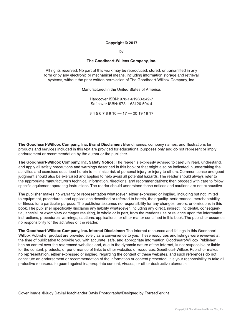 Copyright Goodheart-Willcox Co., Inc. Copyright © 2017 by The Goodheart-Willcox Company, Inc. All rights reserved. No part of this work may be reproduced, stored, or transmitted in any form or by any electronic or mechanical means, including information storage and retrieval systems, without the prior written permission of The Goodheart-Willcox Company, Inc. Manufactured in the United States of America. Hardcover ISBN: 978-1-61960-242-7 Softcover ISBN: 978-1-63126-504-4 3 4 5 6 7 8 9 10 — 17 — 20 19 18 17 The Goodheart-Willcox Company, Inc. Brand Disclaimer: Brand names, company names, and illustrations for products and services included in this text are provided for educational purposes only and do not represent or imply endorsement or recommendation by the author or the publisher. The Goodheart-Willcox Company, Inc. Safety Notice: The reader is expressly advised to carefully read, understand, and apply all safety precautions and warnings described in this book or that might also be indicated in undertaking the activities and exercises described herein to minimize risk of personal injury or injury to others. Common sense and good judgment should also be exercised and applied to help avoid all potential hazards. The reader should always refer to the appropriate manufacturer’s technical information, directions, and recommendations then proceed with care to follow specifi c equipment operating instructions. The reader should understand these notices and cautions are not exhaustive. The publisher makes no warranty or representation whatsoever, either expressed or implied, including but not limited to equipment, procedures, and applications described or referred to herein, their quality, performance, merchantability, or fi tness for a particular purpose. The publisher assumes no responsibility for any changes, errors, or omissions in this book. The publisher specifi cally disclaims any liability whatsoever, including any direct, indirect, incidental, consequen- tial, special, or exemplary damages resulting, in whole or in part, from the reader’s use or reliance upon the information, instructions, procedures, warnings, cautions, applications, or other matter contained in this book. The publisher assumes no responsibility for the activities of the reader. The Goodheart-Willcox Company, Inc. Internet Disclaimer: The Internet resources and listings in this Goodheart- Willcox Publisher product are provided solely as a convenience to you. These resources and listings were reviewed at the time of publication to provide you with accurate, safe, and appropriate information. Goodheart-Willcox Publisher has no control over the referenced websites and, due to the dynamic nature of the Internet, is not responsible or liable for the content, products, or performance of links to other websites or resources. Goodheart-Willcox Publisher makes no representation, either expressed or implied, regarding the content of these websites, and such references do not constitute an endorsement or recommendation of the information or content presented. It is your responsibility to take all protective measures to guard against inappropriate content, viruses, or other destructive elements. Cover Image: ©Judy Davis/Hoachlander Davis Photography/Designed by ForrestPerkins