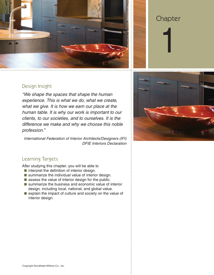 Chapter 1 The Value of Interior Design 5 Copyright Goodheart-Willcox Co., Inc. Design Insight “We shape the spaces that shape the human experience. This is what we do, what we create, what we give. It is how we earn our place at the human table. It is why our work is important to our clients, to our societies, and to ourselves. It is the difference we make and why we choose this noble profession.” International Federation of Interior Architects/Designers (IFI) DFIE Interiors Declaration Learning Targets After studying this chapter, you will be able to ■ interpret the defi nition of interior design. ■ summarize the individual value of interior design. ■ assess the value of interior design for the public. ■ summarize the business and economic value of interior design, including local, national, and global value. ■ explain the impact of culture and society on the value of interior design. Chapter 1