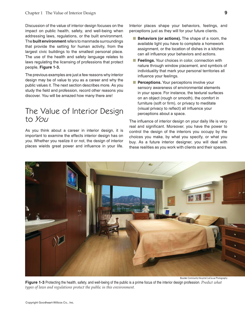 Chapter 1 The Value of Interior Design 9 Copyright Goodheart-Willcox Co., Inc. Discussion of the value of interior design focuses on the impact on public health, safety, and well-being when addressing laws, regulations, or the built environment. The built environment refers to manmade surroundings that provide the setting for human activity, from the largest civic buildings to the smallest personal place. The use of the health and safety language relates to laws regulating the licensing of professions that protect people, Figure 1-3. The previous examples are just a few reasons why interior design may be of value to you as a career and why the public values it. The next section describes more. As you study the fi eld and profession, record other reasons you discover. You will be amazed how many there are! The Value of Interior Design to As you think about a career in interior design, it is important to examine the effects interior design has on you. Whether you realize it or not, the design of interior places wields great power and infl uence in your life. Boulder Community Hospital/LaCasse Photography Figure 1-3 Protecting the health, safety, and well-being of the public is a prime focus of the interior design profession. Predict what types of laws and regulations protect the public in this environment. Interior places shape your behaviors, feelings, and perceptions just as they will for your future clients. ■ Behaviors (or actions). The shape of a room, the available light you have to complete a homework assignment, or the location of dishes in a kitchen can all infl uence your behaviors and actions. ■ Feelings. Your choices in color, connection with nature through window placement, and symbols of individuality that mark your personal territories all infl uence your feelings. ■ Perceptions. Your perceptions involve your sensory awareness of environmental elements in your space. For instance, the textural surfaces on an object (rough or smooth), the comfort in furniture (soft or fi rm), or privacy to meditate (visual privacy to refl ect) all infl uence your perceptions about a space. The infl uence of interior design on your daily life is very real and signifi cant. Moreover, you have the power to control the design of the interiors you occupy by the choices you make, by what you specify, or what you buy. As a future interior designer, you will deal with these realities as you work with clients and their spaces.