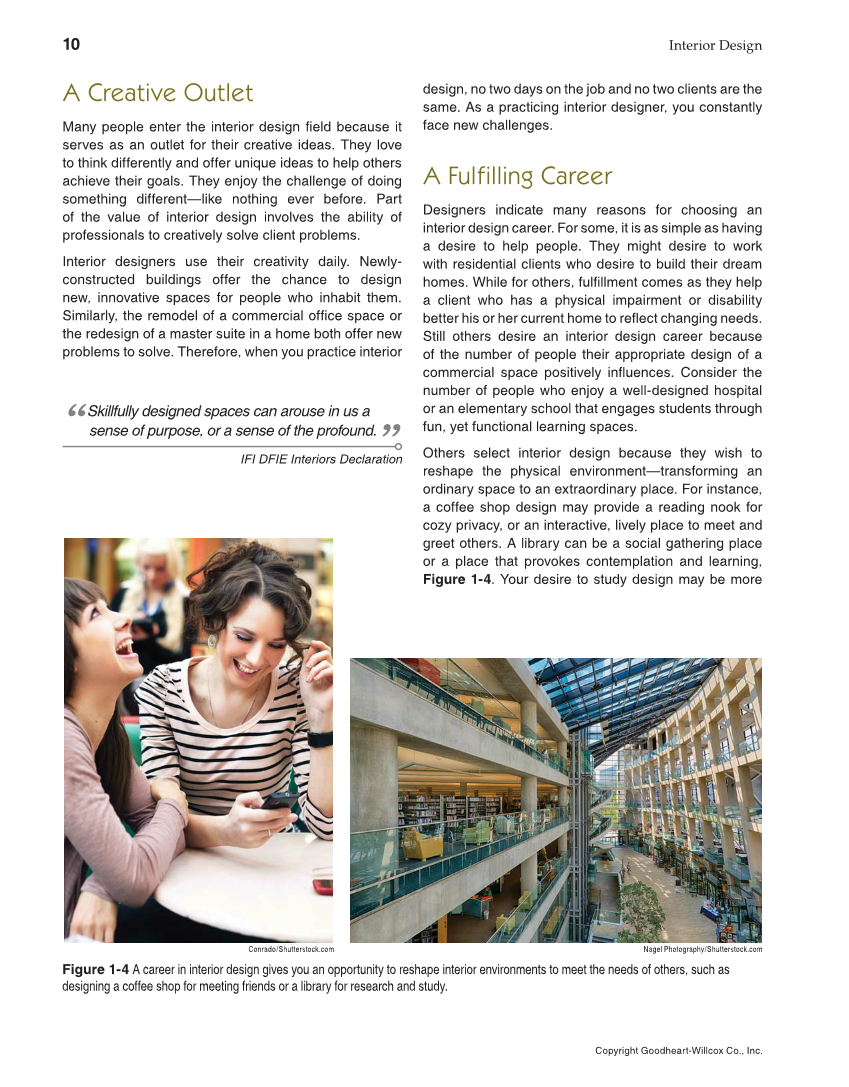 10 Interior Design Copyright Goodheart-Willcox Co., Inc. A Creative Outlet Many people enter the interior design fi eld because it serves as an outlet for their creative ideas. They love to think differently and offer unique ideas to help others achieve their goals. They enjoy the challenge of doing something different—like nothing ever before. Part of the value of interior design involves the ability of professionals to creatively solve client problems. Interior designers use their creativity daily. Newly- constructed buildings offer the chance to design new, innovative spaces for people who inhabit them. Similarly, the remodel of a commercial offi ce space or the redesign of a master suite in a home both offer new problems to solve. Therefore, when you practice interior design, no two days on the job and no two clients are the same. As a practicing interior designer, you constantly face new challenges. A Fulfilling Career Designers indicate many reasons for choosing an interior design career. For some, it is as simple as having a desire to help people. They might desire to work with residential clients who desire to build their dream homes. While for others, fulfi llment comes as they help a client who has a physical impairment or disability better his or her current home to refl ect changing needs. Still others desire an interior design career because of the number of people their appropriate design of a commercial space positively infl uences. Consider the number of people who enjoy a well-designed hospital or an elementary school that engages students through fun, yet functional learning spaces. Others select interior design because they wish to reshape the physical environment—transforming an ordinary space to an extraordinary place. For instance, a coffee shop design may provide a reading nook for cozy privacy, or an interactive, lively place to meet and greet others. A library can be a social gathering place or a place that provokes contemplation and learning, Figure 1-4. Your desire to study design may be more Figure 1-4 A career in interior design gives you an opportunity to reshape interior environments to meet the needs of others, such as designing a coffee shop for meeting friends or a library for research and study. Nagel Photography/Shutterstock.com “Skillfully designed spaces can arouse in us a sense of purpose, or a sense of the profound.” IFI DFIE Interiors Declaration Conrado/Shutterstock.com