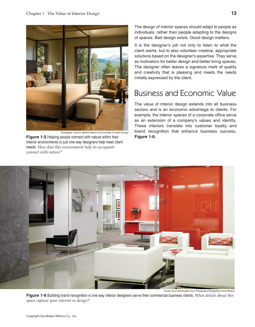 Chapter 1 The Value of Interior Design 13 Copyright Goodheart-Willcox Co., Inc. The design of interior spaces should adapt to people as individuals, rather than people adapting to the designs of spaces. Bad design exists. Good design matters. It is the designer’s job not only to listen to what the client wants, but to also volunteer creative, appropriate solutions based on the designer’s expertise. They serve as motivators for better design and better living spaces. The designer often leaves a signature mark of quality and creativity that is pleasing and meets the needs initially expressed by the client. Business and Economic Value The value of interior design extends into all business sectors and is an economic advantage to clients. For example, the interior spaces of a corporate offi ce serve as an extension of a company’s values and identity. These interiors translate into customer loyalty and brand recognition that enhance business success, Figure 1-6. Photograph: David O. Marlow/Interiors by Associates III Interior Design Figure 1-5 Helping people connect with nature within their interior environments is just one way designers help meet client needs. How does this environment help its occupants connect with nature? ©Judy Davis/Hoachlander Davis Photography/Designed by ForrestPerkins Figure 1-6 Building brand recognition is one way interior designers serve their commercial business clients. What details about this space capture your interest in design?