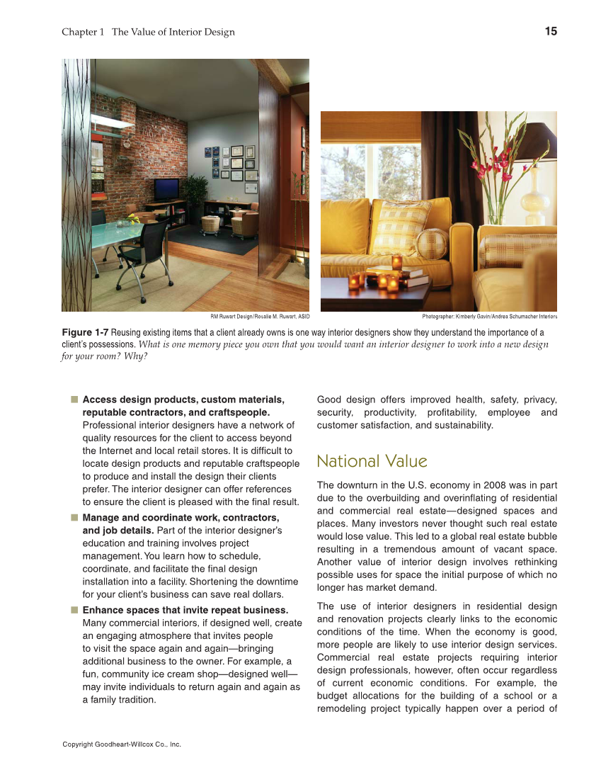 Chapter 1 The Value of Interior Design 15 Copyright Goodheart-Willcox Co., Inc. ■ Access design products, custom materials, reputable contractors, and craftspeople. Professional interior designers have a network of quality resources for the client to access beyond the Internet and local retail stores. It is diffi cult to locate design products and reputable craftspeople to produce and install the design their clients prefer. The interior designer can offer references to ensure the client is pleased with the fi nal result. ■ Manage and coordinate work, contractors, and job details. Part of the interior designer’s education and training involves project management. You learn how to schedule, coordinate, and facilitate the fi nal design installation into a facility. Shortening the downtime for your client’s business can save real dollars. ■ Enhance spaces that invite repeat business. Many commercial interiors, if designed well, create an engaging atmosphere that invites people to visit the space again and again—bringing additional business to the owner. For example, a fun, community ice cream shop—designed well— may invite individuals to return again and again as a family tradition. Good design offers improved health, safety, privacy, security, productivity, profi tability, employee and customer satisfaction, and sustainability. National Value The downturn in the U.S. economy in 2008 was in part due to the overbuilding and overinfl ating of residential and commercial real estate—designed spaces and places. Many investors never thought such real estate would lose value. This led to a global real estate bubble resulting in a tremendous amount of vacant space. Another value of interior design involves rethinking possible uses for space the initial purpose of which no longer has market demand. The use of interior designers in residential design and renovation projects clearly links to the economic conditions of the time. When the economy is good, more people are likely to use interior design services. Commercial real estate projects requiring interior design professionals, however, often occur regardless of current economic conditions. For example, the budget allocations for the building of a school or a remodeling project typically happen over a period of Figure 1-7 Reusing existing items that a client already owns is one way interior designers show they understand the importance of a client’s possessions. What is one memory piece you own that you would want an interior designer to work into a new design for your room? Why? Photographer: Kimberly Gavin/Andrea Schumacher Interiors RM Ruwart Design/Rosalie M. Ruwart, ASID