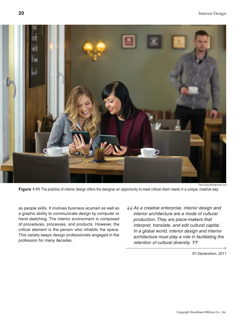 20 Interior Design Copyright Goodheart-Willcox Co., Inc. as people skills. It involves business acumen as well as a graphic ability to communicate design by computer or hand sketching. The interior environment is composed of procedures, processes, and products. However, the critical element is the person who inhabits the space. This variety keeps design professionals engaged in the profession for many decades. “ As a creative enterprise, interior design and interior architecture are a mode of cultural production. They are place-makers that interpret, translate, and edit cultural capital. In a global world, interior design and interior architecture must play a role in facilitating the retention of cultural diversity.” IFI Declaration, 2011 Tyler Olson/Shutterstock.com Figure 1-11 The practice of interior design offers the designer an opportunity to meet critical client needs in a unique, creative way.