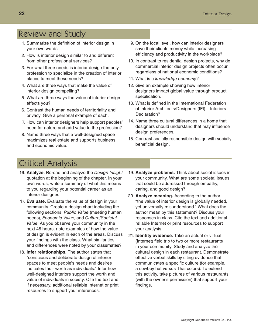 22 Interior Design Copyright Goodheart-Willcox Co., Inc. Review and Study 1. Summarize the definition of interior design in your own words. 2. How is interior design similar to and different from other professional services? 3. For what three needs is interior design the only profession to specialize in the creation of interior places to meet these needs? 4. What are three ways that make the value of interior design compelling? 5. What are three ways the value of interior design affects you? 6. Contrast the human needs of territoriality and privacy. Give a personal example of each. 7. How can interior designers help support peoples’ need for nature and add value to the profession? 8. Name three ways that a well-designed space maximizes real estate and supports business and economic value. 9. On the local level, how can interior designers save their clients money while increasing efficiency and productivity in the workplace? 10. In contrast to residential design projects, why do commercial interior design projects often occur regardless of national economic conditions? 11. What is a knowledge economy? 12. Give an example showing how interior designers impact global value through product specification. 13. What is defined in the International Federation of Interior Architects/Designers (IFI)—Interiors Declaration? 14. Name three cultural differences in a home that designers should understand that may influence design preferences. 15. Contrast socially responsible design with socially beneficial design. Critical Analysis 16. Analyze. Reread and analyze the Design Insight quotation at the beginning of the chapter. In your own words, write a summary of what this means to you regarding your potential career as an interior designer. 17. Evaluate. Evaluate the value of design in your community. Create a design chart including the following sections: Public Value (meeting human needs), Economic Value, and Culture/Societal Value. As you observe your community in the next 48 hours, note examples of how the value of design is evident in each of the areas. Discuss your findings with the class. What similarities and differences were noted by your classmates? 18. Infer relationships. The author states that “conscious and deliberate design of interior spaces to meet people’s needs and desires indicates their worth as individuals.” Infer how well-designed interiors support the worth and value of individuals in society. Cite the text and if necessary, additional reliable Internet or print resources to support your inferences. 19. Analyze problems. Think about social issues in your community. What are some societal issues that could be addressed through empathy, caring, and good design? 20. Analyze meaning. According to the author “the value of interior design is globally needed, yet universally misunderstood.” What does the author mean by this statement? Discuss your responses in class. Cite the text and additional reliable Internet or print resources to support your analysis. 21. Identity evidence. Take an actual or virtual (Internet) field trip to two or more restaurants in your community. Study and analyze the cultural design in each restaurant. Demonstrate effective verbal skills by citing evidence that communicates a specific culture (for example, a cowboy hat versus Thai colors). To extend this activity, take pictures of various restaurants (with the owner’s permission) that support your findings.