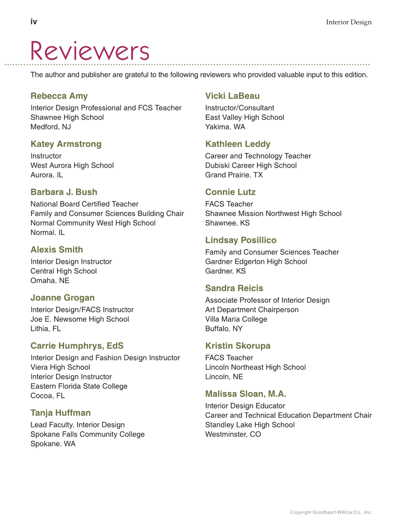 Copyright Goodheart-Willcox Co., Inc. iv Interior Design Reviewers The author and publisher are grateful to the following reviewers who provided valuable input to this edition. Rebecca Amy Interior Design Professional and FCS Teacher Shawnee High School Medford, NJ Katey Armstrong Instructor West Aurora High School Aurora, IL Barbara J. Bush National Board Certifi ed Teacher Family and Consumer Sciences Building Chair Normal Community West High School Normal, IL Alexis Smith Interior Design Instructor Central High School Omaha, NE Joanne Grogan Interior Design/FACS Instructor Joe E. Newsome High School Lithia, FL Carrie Humphrys, EdS Interior Design and Fashion Design Instructor Viera High School Interior Design Instructor Eastern Florida State College Cocoa, FL Tanja Huffman Lead Faculty, Interior Design Spokane Falls Community College Spokane, WA Vicki LaBeau Instructor/Consultant East Valley High School Yakima, WA Kathleen Leddy Career and Technology Teacher Dubiski Career High School Grand Prairie, TX Connie Lutz FACS Teacher Shawnee Mission Northwest High School Shawnee, KS Lindsay Posillico Family and Consumer Sciences Teacher Gardner Edgerton High School Gardner, KS Sandra Reicis Associate Professor of Interior Design Art Department Chairperson Villa Maria College Buffalo, NY Kristin Skorupa FACS Teacher Lincoln Northeast High School Lincoln, NE Malissa Sloan, M.A. Interior Design Educator Career and Technical Education Department Chair Standley Lake High School Westminster, CO