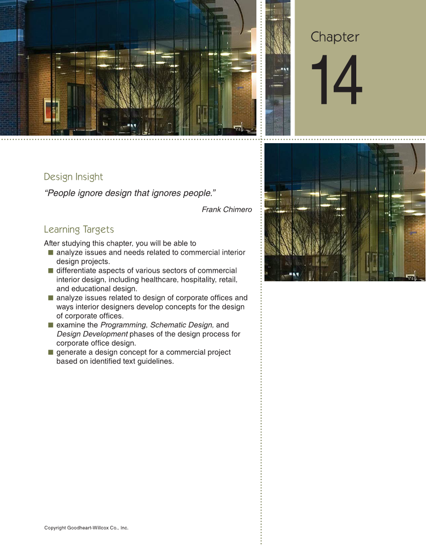 Chapter 14 Commercial Interior Design Applications 479 Copyright Goodheart-Willcox Co., Inc. Design Insight “People ignore design that ignores people.” Frank Chimero Learning Targets After studying this chapter, you will be able to ■ analyze issues and needs related to commercial interior design projects. ■ differentiate aspects of various sectors of commercial interior design, including healthcare, hospitality, retail, and educational design. ■ analyze issues related to design of corporate offi ces and ways interior designers develop concepts for the design of corporate offi ces. ■ examine the Programming, Schematic Design, and Design Development phases of the design process for corporate offi ce design. ■ generate a design concept for a commercial project based on identifi ed text guidelines. 14Chapter