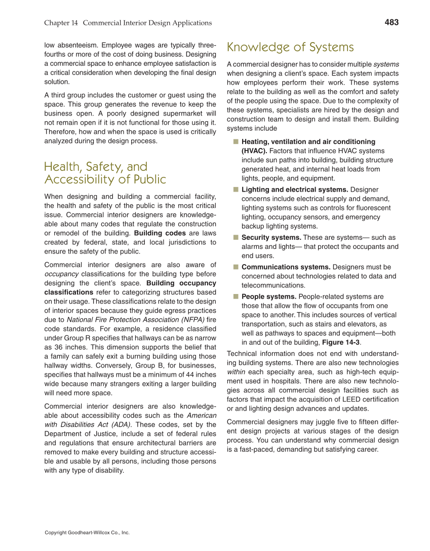 Chapter 14 Commercial Interior Design Applications 483 Copyright Goodheart-Willcox Co., Inc. low absenteeism. Employee wages are typically three- fourths or more of the cost of doing business. Designing a commercial space to enhance employee satisfaction is a critical consideration when developing the fi nal design solution. A third group includes the customer or guest using the space. This group generates the revenue to keep the business open. A poorly designed supermarket will not remain open if it is not functional for those using it. Therefore, how and when the space is used is critically analyzed during the design process. Health, Safety, and Accessibility of Public When designing and building a commercial facility, the health and safety of the public is the most critical issue. Commercial interior designers are knowledge- able about many codes that regulate the construction or remodel of the building. Building codes are laws created by federal, state, and local jurisdictions to ensure the safety of the public. Commercial interior designers are also aware of occupancy classifi cations for the building type before designing the client’s space. Building occupancy classifi cations refer to categorizing structures based on their usage. These classifi cations relate to the design of interior spaces because they guide egress practices due to National Fire Protection Association (NFPA) fi re code standards. For example, a residence classifi ed under Group R specifi es that hallways can be as narrow as 36 inches. This dimension supports the belief that a family can safely exit a burning building using those hallway widths. Conversely, Group B, for businesses, specifi es that hallways must be a minimum of 44 inches wide because many strangers exiting a larger building will need more space. Commercial interior designers are also knowledge- able about accessibility codes such as the American with Disabilities Act (ADA). These codes, set by the Department of Justice, include a set of federal rules and regulations that ensure architectural barriers are removed to make every building and structure accessi- ble and usable by all persons, including those persons with any type of disability. Knowledge of Systems A commercial designer has to consider multiple systems when designing a client’s space. Each system impacts how employees perform their work. These systems relate to the building as well as the comfort and safety of the people using the space. Due to the complexity of these systems, specialists are hired by the design and construction team to design and install them. Building systems include ■ Heating, ventilation and air conditioning (HVAC). Factors that infl uence HVAC systems include sun paths into building, building structure generated heat, and internal heat loads from lights, people, and equipment. ■ Lighting and electrical systems. Designer concerns include electrical supply and demand, lighting systems such as controls for fl uorescent lighting, occupancy sensors, and emergency backup lighting systems. ■ Security systems. These are systems— such as alarms and lights— that protect the occupants and end users. ■ Communications systems. Designers must be concerned about technologies related to data and telecommunications. ■ People systems. People-related systems are those that allow the fl ow of occupants from one space to another. This includes sources of vertical transportation, such as stairs and elevators, as well as pathways to spaces and equipment—both in and out of the building, Figure 14-3. Technical information does not end with understand- ing building systems. There are also new technologies within each specialty area, such as high-tech equip- ment used in hospitals. There are also new technolo- gies across all commercial design facilities such as factors that impact the acquisition of LEED certifi cation or and lighting design advances and updates. Commercial designers may juggle fi ve to fi fteen differ- ent design projects at various stages of the design process. You can understand why commercial design is a fast-paced, demanding but satisfying career.
