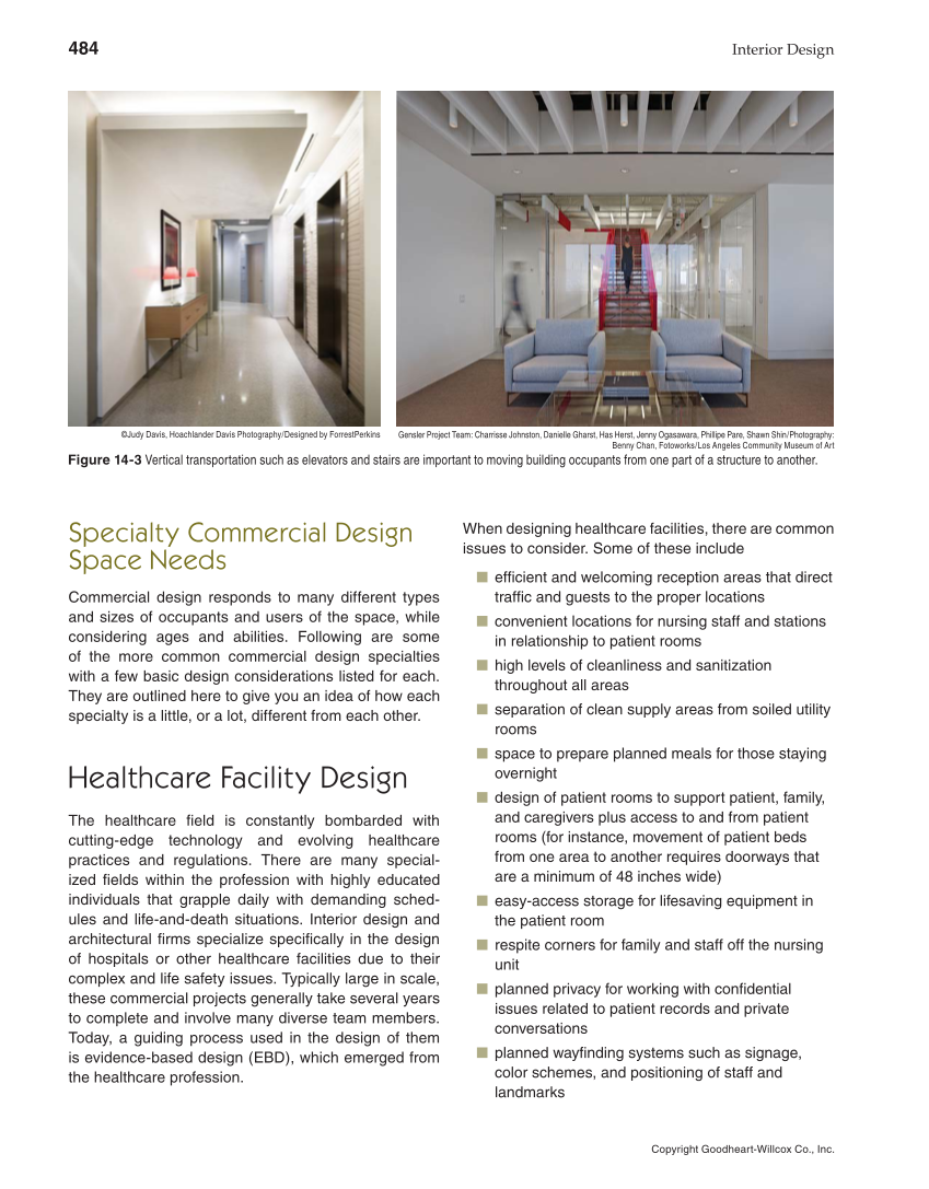 484 Interior Design Copyright Goodheart-Willcox Co., Inc. S pecialty Commercial Design Space Needs Commercial design responds to many different types and sizes of occupants and users of the space, while considering ages and abilities. Following are some of the more common commercial design specialties with a few basic design considerations listed for each. They are outlined here to give you an idea of how each specialty is a little, or a lot, different from each other. Healthcare Facility Design The healthcare fi eld is constantly bombarded with cutting-edge technology and evolving healthcare practices and regulations. There are many special- ized fi elds within the profession with highly educated individuals that grapple daily with demanding sched- ules and life-and-death situations. Interior design and architectural fi rms specialize specifi cally in the design of hospitals or other healthcare facilities due to their complex and life safety issues. Typically large in scale, these commercial projects generally take several years to complete and involve many diverse team members. Today, a guiding process used in the design of them is evidence-based design (EBD), which emerged from the healthcare profession. When designing healthcare facilities, there are common issues to consider. Some of these include ■ effi cient and welcoming reception areas that direct traffi c and guests to the proper locations ■ convenient locations for nursing staff and stations in relationship to patient rooms ■ high levels of cleanliness and sanitization throughout all areas ■ separation of clean supply areas from soiled utility rooms ■ space to prepare planned meals for those staying overnight ■ design of patient rooms to support patient, family, and caregivers plus access to and from patient rooms (for instance, movement of patient beds from one area to another requires doorways that are a minimum of 48 inches wide) ■ easy-access storage for lifesaving equipment in the patient room ■ respite corners for family and staff off the nursing unit ■ planned privacy for working with confi dential issues related to patient records and private conversations ■ planned wayfi nding systems such as signage, color schemes, and positioning of staff and landmarks Gensler Project Team: Charrisse Johnston, Danielle Gharst, Has Herst, Jenny Ogasawara, Phillipe Pare, Shawn Shin/Photography: Benny Chan, Fotoworks/Los Angeles Community Museum of Art Figure 14-3 Vertical transportation such as elevators and stairs are important to moving building occupants from one part of a structure to another. ©Judy Davis, Hoachlander Davis Photography/Designed by ForrestPerkins