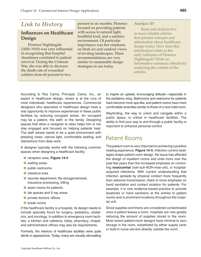 Chapter 14 Commercial Interior Design Applications 485 Copyright Goodheart-Willcox Co., Inc. According to Roz Cama, Principal, Cama, Inc., an expert in healthcare design, stress is at the core of most individuals’ healthcare experiences. Commercial designers who specialize in healthcare design have a real opportunity to improve experiences in these public facilities by reducing occupant stress. An occupant may be a patient, the staff, or the family. Designing spaces that allow a caregiver to relax helps him or her stay engaged and focused on helping patients heal. The staff retreat needs to be a quiet environment with pleasing views, natural light, comfortable seating, and distractions from daily work. A designer typically works with the following common spaces when designing a healthcare facility: ■ reception area, Figure 14-4 ■ waiting areas ■ public restrooms ■ checkout area ■ records department fi le storage/retrieval, insurance processing, billing ■ exam rooms for patients ■ lab spaces and X-ray areas ■ private doctors’ offi ces ■ break rooms If the healthcare facility is a hospital, its design needs to include specialty fl oors for surgery, pediatrics, obstet- rics, and oncology. In addition to emergency room facili- ties, a kitchen and cafeteria, lobby, pharmacy, chapel, and administrative offi ces may also be requirements. Formerly, the interiors of healthcare facilities were quite sterile in appearance. Today, many are visually stimulating to inspire an upbeat, encouraging attitude—especially in the pediatrics wing. Bathrooms and restrooms for patients have become more spa-like, and patient rooms have more comfortable amenities similar to those of a nice hotel room. Wayfi nding, the way to orient and navigate within a public space, is critical in healthcare facilities. The ability to fi nd your way to and through a public facility is important to enhance personal control. Patient Rooms The patient room is very important to achieving a positive healing experience, Figure 14-5. Infection-control strat- egies shape patient room design. No issue has affected the design of inpatient rooms and units more over the past few years than the increased emphasis on control- ling nosocomial (nah-suh-KOH-mee-uhl), or hospital- acquired infections. With current understanding that infection spreads by physical contact more frequently than airborne transmission, there is more emphasis on hand sanitation and contact isolation for patients. For example, it is now evidence-based practice to provide lavatories or hand sanitizers at the entries to patient rooms and in prominent locations throughout the hospi- tal unit. Since supplies and linens are considered contaminated once a patient leaves a room, hospitals are now greatly reducing the amount of supplies stored in the room. Most recent patient-room designs have minimal to zero storage in the room, substituted by either supply carts or built-in nurse servers directly outside the room. Link to History Influences on Healthcare Design Florence Nightingale (1820–1910) was very infl uential in recognizing that hospital cleanliness correlated to patient survival. During the Crimean War, she was able to decrease the death rate of wounded soldiers from 60 percent to two percent in six months. Florence focused on providing patients with access to natural light, healthful food, and a sanitary environment. Of particular importance was her emphasis on fresh air and outdoor views of inviting landscapes. These recommendations are very similar to sustainable design strategies in use today. Analyze It! Read and analyze two or more reliable articles that present concepts and information about healthcare design today. How does this information relate to the early infl uence of Florence Nightingale? Write an informative summary effectively analyzing the content of the articles.