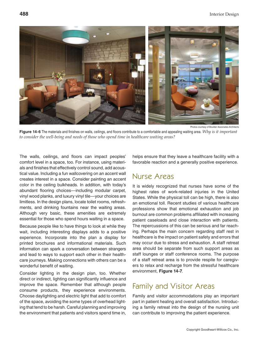 488 Interior Design Copyright Goodheart-Willcox Co., Inc. The walls, ceilings, and fl oors can impact peoples’ comfort level in a space, too. For instance, using materi- als and fi nishes that effectively control sound, add acous- tical value. Including a fun wallcovering on an accent wall creates interest in a space. Consider painting an accent color in the ceiling bulkheads. In addition, with today’s abundant fl ooring choices—including modular carpet, vinyl wood planks, and luxury vinyl tile—your choices are limitless. In the design plans, locate toilet rooms, refresh- ments, and drinking fountains near the waiting areas. Although very basic, these amenities are extremely essential for those who spend hours waiting in a space. Because people like to have things to look at while they wait, including interesting displays adds to a positive experience. Incorporate into the plan a display for printed brochures and informational materials. Such information can spark a conversation between strangers and lead to ways to support each other in their health- care journeys. Making connections with others can be a wonderful benefi t of waiting. Consider lighting in the design plan, too. Whether direct or indirect, lighting can signifi cantly infl uence and improve the space. Remember that although people consume products, they experience environments. Choose daylighting and electric light that add to comfort of the space, avoiding the some types of overhead light- ing that tend to be harsh. Careful planning and improving the environment that patients and visitors spend time in, helps ensure that they leave a healthcare facility with a favorable reaction and a generally positive experience. Nurse Areas It is widely recognized that nurses have some of the highest rates of work-related injuries in the United States. While the physical toll can be high, there is also an emotional toll. Recent studies of various healthcare professions show that emotional exhaustion and job burnout are common problems affi liated with increasing patient caseloads and close interaction with patients. The repercussions of this can be serious and far reach- ing. Perhaps the main concern regarding staff rest in healthcare is the impact on patient safety and errors that may occur due to stress and exhaustion. A staff retreat area should be separate from such support areas as staff lounges or staff conference rooms. The purpose of a staff retreat area is to provide respite for caregiv- ers to relax and recharge from the stressful healthcare environment, Figure 14-7. Family and Visitor Areas Family and visitor accommodations play an important part in patient healing and overall satisfaction. Introduc- ing a family retreat into the design of the nursing unit can contribute to improving the patient experience. Photos courtesy of Boulder Associates Architects Figure 14-6 The materials and fi nishes on walls, ceilings, and fl oors contribute to a comfortable and appealing waiting area. Why is it important to consider the well-being and needs of those who spend time in healthcare waiting areas?