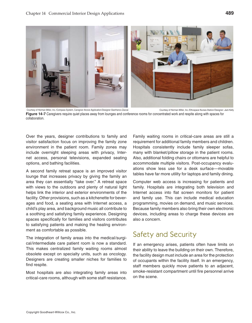 Chapter 14 Commercial Interior Design Applications 489 Copyright Goodheart-Willcox Co., Inc. Over the years, designer contributions to family and visitor satisfaction focus on improving the family zone environment in the patient room. Family zones may include overnight sleeping areas with privacy, Inter- net access, personal televisions, expanded seating options, and bathing facilities. A second family retreat space is an improved visitor lounge that increases privacy by giving the family an area they can essentially “take over.” A retreat space with views to the outdoors and plenty of natural light helps link the interior and exterior environments of the facility. Other provisions, such as a kitchenette for bever- ages and food, a seating area with Internet access, a child’s play area, and background music all contribute to a soothing and satisfying family experience. Designing spaces specifi cally for families and visitors contributes to satisfying patients and making the healing environ- ment as comfortable as possible. The integration of family areas into the medical/surgi- cal/intermediate care patient room is now a standard. This makes centralized family waiting rooms almost obsolete except on specialty units, such as oncology. Designers are creating smaller niches for families to fi nd respite. Most hospitals are also integrating family areas into critical-care rooms, although with some staff resistance. Family waiting rooms in critical-care areas are still a requirement for additional family members and children. Hospitals consistently include family sleeper sofas, many with blanket/pillow storage in the patient rooms. Also, additional folding chairs or ottomans are helpful to accommodate multiple visitors. Post-occupancy evalu- ations show less use for a desk surface—movable tables have far more utility for laptops and family dining. Computer web access is increasing for patients and family. Hospitals are integrating both television and Internet access into fl at screen monitors for patient and family use. This can include medical education programming, movies on demand, and music services. Because family members also bring their own electronic devices, including areas to charge these devices are also a concern. Safety and Security If an emergency arises, patients often have limits on their ability to leave the building on their own. Therefore, the facility design must include an area for the protection of occupants within the facility itself. In an emergency, staff members quickly move patients to an adjacent, smoke-resistant compartment until fi re personnel arrive on the scene. Courtesy of Herman Miller, Inc./Ethospace Nurses Station/Designer: Jack Kelly Figure 14-7 Caregivers require quiet places away from lounges and conference rooms for concentrated work and respite along with spaces for collaboration. Courtesy of Herman Miller, Inc./Compass System, Caregiver Alcove Application/Designer Gianfranco Zaccai