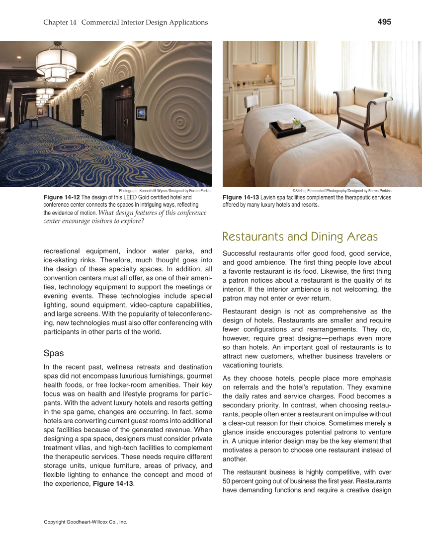 Chapter 14 Commercial Interior Design Applications 495 Copyright Goodheart-Willcox Co., Inc. recreational equipment, indoor water parks, and ice-skating rinks. Therefore, much thought goes into the design of these specialty spaces. In addition, all convention centers must all offer, as one of their ameni- ties, technology equipment to support the meetings or evening events. These technologies include special lighting, sound equipment, video-capture capabilities, and large screens. With the popularity of teleconferenc- ing, new technologies must also offer conferencing with participants in other parts of the world. Spas In the recent past, wellness retreats and destination spas did not encompass luxurious furnishings, gourmet health foods, or free locker-room amenities. Their key focus was on health and lifestyle programs for partici- pants. With the advent luxury hotels and resorts getting in the spa game, changes are occurring. In fact, some hotels are converting current guest rooms into additional spa facilities because of the generated revenue. When designing a spa space, designers must consider private treatment villas, and high-tech facilities to complement the therapeutic services. These needs require different storage units, unique furniture, areas of privacy, and fl exible lighting to enhance the concept and mood of the experience, Figure 14-13. Restaurants and Dining Areas Successful restaurants offer good food, good service, and good ambience. The fi rst thing people love about a favorite restaurant is its food. Likewise, the fi rst thing a patron notices about a restaurant is the quality of its interior. If the interior ambience is not welcoming, the patron may not enter or ever return. Restaurant design is not as comprehensive as the design of hotels. Restaurants are smaller and require fewer confi gurations and rearrangements. They do, however, require great designs—perhaps even more so than hotels. An important goal of restaurants is to attract new customers, whether business travelers or vacationing tourists. As they choose hotels, people place more emphasis on referrals and the hotel’s reputation. They examine the daily rates and service charges. Food becomes a secondary priority. In contrast, when choosing restau- rants, people often enter a restaurant on impulse without a clear-cut reason for their choice. Sometimes merely a glance inside encourages potential patrons to venture in. A unique interior design may be the key element that motivates a person to choose one restaurant instead of another. The restaurant business is highly competitive, with over 50 percent going out of business the fi rst year. Restaurants have demanding functions and require a creative design Photograph: Kenneth M Wyner/Designed by ForrestPerkins Figure 14-12 The design of this LEED Gold certifi ed hotel and conference center connects the spaces in intriguing ways, refl ecting the evidence of motion. What design features of this conference center encourage visitors to explore? ©Stirling Elemendorf Photography/Designed by ForrestPerkins Figure 14-13 Lavish spa facilities complement the therapeutic services offered by many luxury hotels and resorts.