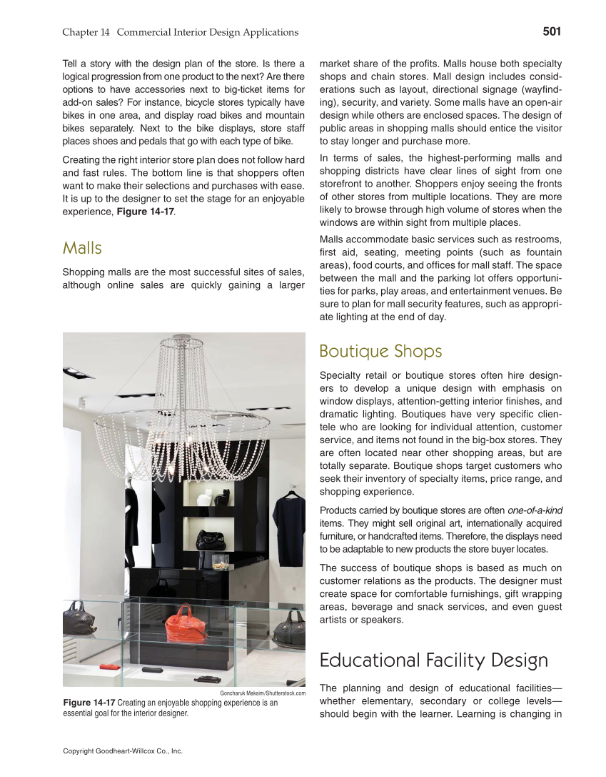 Chapter 14 Commercial Interior Design Applications 501 Copyright Goodheart-Willcox Co., Inc. Tell a story with the design plan of the store. Is there a logical progression from one product to the next? Are there options to have accessories next to big-ticket items for add-on sales? For instance, bicycle stores typically have bikes in one area, and display road bikes and mountain bikes separately. Next to the bike displays, store staff places shoes and pedals that go with each type of bike. Creating the right interior store plan does not follow hard and fast rules. The bottom line is that shoppers often want to make their selections and purchases with ease. It is up to the designer to set the stage for an enjoyable experience, Figure 14-17. Malls Shopping malls are the most successful sites of sales, although online sales are quickly gaining a larger market share of the profi ts. Malls house both specialty shops and chain stores. Mall design includes consid- erations such as layout, directional signage (wayfi nd- ing), security, and variety. Some malls have an open-air design while others are enclosed spaces. The design of public areas in shopping malls should entice the visitor to stay longer and purchase more. In terms of sales, the highest-performing malls and shopping districts have clear lines of sight from one storefront to another. Shoppers enjoy seeing the fronts of other stores from multiple locations. They are more likely to browse through high volume of stores when the windows are within sight from multiple places. Malls accommodate basic services such as restrooms, fi rst aid, seating, meeting points (such as fountain areas), food courts, and offi ces for mall staff. The space between the mall and the parking lot offers opportuni- ties for parks, play areas, and entertainment venues. Be sure to plan for mall security features, such as appropri- ate lighting at the end of day. Boutique Shops Specialty retail or boutique stores often hire design- ers to develop a unique design with emphasis on window displays, attention-getting interior fi nishes, and dramatic lighting. Boutiques have very specifi c clien- tele who are looking for individual attention, customer service, and items not found in the big-box stores. They are often located near other shopping areas, but are totally separate. Boutique shops target customers who seek their inventory of specialty items, price range, and shopping experience. Products carried by boutique stores are often one-of-a-kind items. They might sell original art, internationally acquired furniture, or handcrafted items. Therefore, the displays need to be adaptable to new products the store buyer locates. The success of boutique shops is based as much on customer relations as the products. The designer must create space for comfortable furnishings, gift wrapping areas, beverage and snack services, and even guest artists or speakers. Educational Facility Design The planning and design of educational facilities— whether elementary, secondary or college levels— should begin with the learner. Learning is changing in Goncharuk Maksim/Shutterstock.com Figure 14-17 Creating an enjoyable shopping experience is an essential goal for the interior designer.