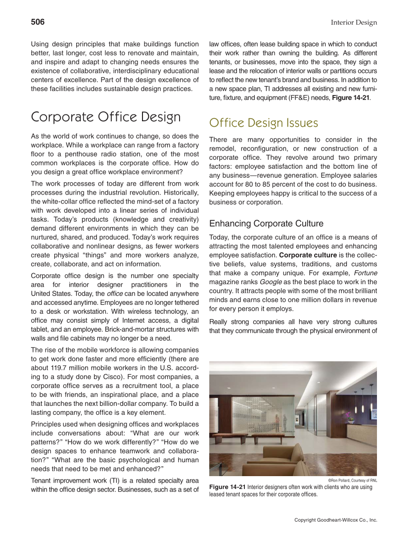506 Interior Design Copyright Goodheart-Willcox Co., Inc. Using design principles that make buildings function better, last longer, cost less to renovate and maintain, and inspire and adapt to changing needs ensures the existence of collaborative, interdisciplinary educational centers of excellence. Part of the design excellence of these facilities includes sustainable design practices. Corporate Office Design As the world of work continues to change, so does the workplace. While a workplace can range from a factory fl oor to a penthouse radio station, one of the most common workplaces is the corporate offi ce. How do you design a great offi ce workplace environment? The work processes of today are different from work processes during the industrial revolution. Historically, the white-collar offi ce refl ected the mind-set of a factory with work developed into a linear series of individual tasks. Today’s products (knowledge and creativity) demand different environments in which they can be nurtured, shared, and produced. Today’s work requires collaborative and nonlinear designs, as fewer workers create physical “things” and more workers analyze, create, collaborate, and act on information. Corporate offi ce design is the number one specialty area for interior designer practitioners in the United States. Today, the offi ce can be located anywhere and accessed anytime. Employees are no longer tethered to a desk or workstation. With wireless technology, an offi ce may consist simply of Internet access, a digital tablet, and an employee. Brick-and-mortar structures with walls and fi le cabinets may no longer be a need. The rise of the mobile workforce is allowing companies to get work done faster and more effi ciently (there are about 119.7 million mobile workers in the U.S. accord- ing to a study done by Cisco). For most companies, a corporate offi ce serves as a recruitment tool, a place to be with friends, an inspirational place, and a place that launches the next billion-dollar company. To build a lasting company, the offi ce is a key element. Principles used when designing offi ces and workplaces include conversations about: “What are our work patterns?” “How do we work differently?” “How do we design spaces to enhance teamwork and collabora- tion?” “What are the basic psychological and human needs that need to be met and enhanced?” Tenant improvement work (TI) is a related specialty area within the offi ce design sector. Businesses, such as a set of law offi ces, often lease building space in which to conduct their work rather than owning the building. As different tenants, or businesses, move into the space, they sign a lease and the relocation of interior walls or partitions occurs to refl ect the new tenant’s brand and business. In addition to a new space plan, TI addresses all existing and new furni- ture, fi xture, and equipment (FF&E) needs, Figure 14-21. Office Design Issues There are many opportunities to consider in the remodel, reconfi guration, or new construction of a corporate offi ce. They revolve around two primary factors: employee satisfaction and the bottom line of any business—revenue generation. Employee salaries account for 80 to 85 percent of the cost to do business. Keeping employees happy is critical to the success of a business or corporation. Enhancing Corporate Culture Today, the corporate culture of an offi ce is a means of attracting the most talented employees and enhancing employee satisfaction. Corporate culture is the collec- tive beliefs, value systems, traditions, and customs that make a company unique. For example, Fortune magazine ranks Google as the best place to work in the country. It attracts people with some of the most brilliant minds and earns close to one million dollars in revenue for every person it employs. Really strong companies all have very strong cultures that they communicate through the physical environment of ©Ron Pollard, Courtesy of RNL Figure 14-21 Interior designers often work with clients who are using leased tenant spaces for their corporate offi ces.