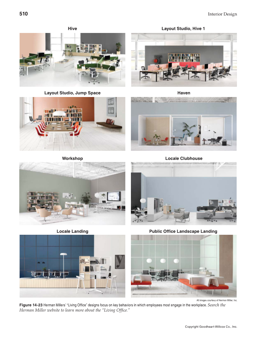 510 Interior Design Copyright Goodheart-Willcox Co., Inc. Public Office Landscape Landing Hive Haven Workshop Locale Clubhouse Layout Studio, Hive 1 Layout Studio, Jump Space Locale Landing All images courtesy of Herman Miller, Inc. Figure 14-23 Herman Millers’ “Living Offi ce” designs focus on key behaviors in which employees most engage in the workplace. Search the Herman Miller website to learn more about the “Living Offi ce.”