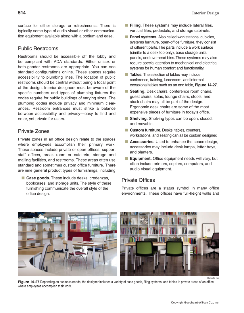 514 Interior Design Copyright Goodheart-Willcox Co., Inc. surface for either storage or refreshments. There is typically some type of audio-visual or other communica- tion equipment available along with a podium and easel. Public Restrooms Restrooms should be accessible off the lobby and be compliant with ADA standards. Either unisex or both-gender restrooms are appropriate. You can see standard confi gurations online. These spaces require accessibility to plumbing lines. The location of public restrooms should be central without being a focal point of the design. Interior designers must be aware of the specifi c numbers and types of plumbing fi xtures the codes require for public buildings of varying sizes. The plumbing codes include privacy and minimum clear- ances. Restroom entrances must strike a balance between accessibility and privacy—easy to fi nd and enter, yet private for users. Private Zones Private zones in an offi ce design relate to the spaces where employees accomplish their primary work. These spaces include private or open offi ces, support staff offi ces, break room or cafeteria, storage and mailing facilities, and restrooms. These areas often use standard and sometimes custom offi ce furniture. There are nine general product types of furnishings, including ■ Case goods. These include desks, credenzas, bookcases, and storage units. The style of these furnishing communicate the overall style of the offi ce design. ■ Filing. These systems may include lateral fi les, vertical fi les, pedestals, and storage cabinets. ■ Panel systems. Also called workstations, cubicles, systems furniture, open-offi ce furniture, they consist of different parts. The parts include a work surface (similar to a desk top only), base storage units, panels, and overhead bins. These systems may also require special attention to mechanical and electrical systems for human comfort and functionality. ■ Tables. The selection of tables may include conference, training, lunchroom, and informal occasional tables such as an end table, Figure 14-27. ■ Seating. Desk chairs, conference room chairs, guest chairs, sofas, lounge chairs, stools, and stack chairs may all be part of the design. Ergonomic desk chairs are some of the most expensive pieces of furniture in today’s offi ce. ■ Shelving. Shelving types can be open, closed, and movable. ■ Custom furniture. Desks, tables, counters, workstations, and seating can all be custom designed ■ Accessories. Used to enhance the space design, accessories may include desk lamps, letter trays, and planters. ■ Equipment. Offi ce equipment needs will vary, but often include printers, copiers, computers, and audio-visual equipment. Private Offi ces Private offi ces are a status symbol in many offi ce environments. These offi ces have full-height walls and Haworth, Inc. Figure 14-27 Depending on business needs, the designer includes a variety of case goods, fi ling systems, and tables in private areas of an offi ce where employees accomplish their work.