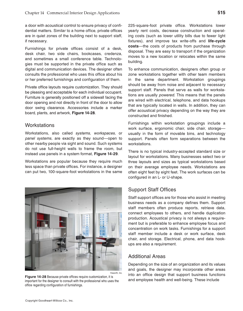Chapter 14 Commercial Interior Design Applications 515 Copyright Goodheart-Willcox Co., Inc. a door with acoustical control to ensure privacy of confi - dential matters. Similar to a home offi ce, private offi ces are in quiet zones of the building next to support staff, if necessary. Furnishings for private offi ces consist of a desk, desk chair, two side chairs, bookcases, credenza, and sometimes a small conference table. Technolo- gies must be supported in the private offi ce such as digital and communication devices. The designer often consults the professional who uses this offi ce about his or her preferred furnishings and confi guration of them. Private offi ce layouts require customization. They should be pleasing and acceptable for each individual occupant. Furniture is generally positioned off a sidewall facing the door opening and not directly in front of the door to allow door swing clearance. Accessories include a marker board, plants, and artwork, Figure 14-28. Workstations Workstations, also called systems, workspaces, or panel systems, are exactly as they sound—open to other nearby people via sight and sound. Such systems do not use full-height walls to frame the room, but instead use panels in a system format, Figure 14-29. Workstations are popular because they require much less space than private offi ces. For instance, a designer can put two, 100-square-foot workstations in the same 225-square-foot private offi ce. Workstations lower yearly rent costs, decrease construction and operat- ing costs (such as lower utility bills due to fewer light fi xtures), and improve tax write-offs and life-cycle costs—the costs of products from purchase through disposal. They are easy to transport if the organization moves to a new location or relocates within the same building. To enhance communication, designers often group or zone workstations together with other team members in the same department. Workstation groupings should be away from noise and adjacent to necessary support staff. Panels that serve as walls for worksta- tions are usually powered. This means that the panels are wired with electrical, telephone, and data hookups that are typically located in walls. In addition, they can offer acoustical privacy depending on the way they are constructed and fi nished. Furnishings within workstation groupings include a work surface, ergonomic chair, side chair, storage— usually in the form of movable bins, and technology support. Panels often form separations between the workstations. There is no typical industry-accepted standard size or layout for workstations. Many businesses select two or three layouts and sizes as typical workstations based on their average employee needs. Workstations are often eight feet by eight feet. The work surfaces can be confi gured in an L- or U-shape. Support Staff Offi ces Staff support offi ces are for those who assist in meeting business needs as a company defi nes them. Support staff members often produce reports, retrieve data, connect employees to others, and handle duplication production. Acoustical privacy is not always a require- ment but is preferable to enhance employee focus and concentration on work tasks. Furnishings for a support staff member include a desk or work surface, desk chair, and storage. Electrical, phone, and data hook- ups are also a requirement. Additional Areas Depending on the size of an organization and its values and goals, the designer may incorporate other areas into an offi ce design that support business functions and employee health and well-being. These include Haworth, Inc. Figure 14-28 Because private offi ces require customization, it is important for the designer to consult with the professional who uses the offi ce regarding confi guration of furnishings.