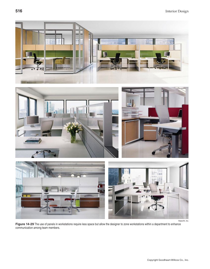 516 Interior Design Copyright Goodheart-Willcox Co., Inc. Haworth, Inc. Figure 14-29 The use of panels in workstations require less space but allow the designer to zone workstations within a department to enhance communication among team members.
