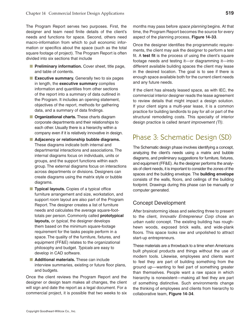 Chapter 14 Commercial Interior Design Applications 519 Copyright Goodheart-Willcox Co., Inc. The Program Report serves two purposes. First, the designer and team need fi nite details of the client’s needs and functions for space. Second, others need macro-information from which to pull economic infor- mation or specifi cs about the space (such as the total square footage of project). The Program Report is often divided into six sections that include ■ Preliminary information. Cover sheet, title page, and table of contents. ■ Executive summary. Generally two to six pages in length, the executive summary compiles information and quantities from other sections of the report into a summary of data outlined in the Program. It includes an opening statement, objectives of the report, methods for gathering data, and a summary of data fi ndings. ■ Organizational charts. These charts diagram corporate departments and their relationships to each other. Usually there is a hierarchy within a company even if it is relatively innovative in design. ■ Adjacency or relationship bubble diagrams. These diagrams indicate both internal and departmental interactions and associations. The internal diagrams focus on individuals, units or groups, and the support functions within each group. The external diagrams focus on interactions across departments or divisions. Designers can create diagrams using the matrix style or bubble diagrams. ■ Typical layouts. Copies of a typical offi ce furniture arrangement and size, workstation, and support room layout are also part of the Program Report. The designer creates a list of furniture needs and calculates the average square-foot- totals per person. Commonly called prototypical layouts, or typical, the designer develops them based on the minimum square-footage requirement for the tasks people perform in a space. The quality of the furniture, fi xtures, and equipment (FF&E) relates to the organizational philosophy and budget. Typicals are easy to develop in CAD software. ■ Additional materials. These can include interview summaries, existing or future fl oor plans, and budgets. Once the client reviews the Program Report and the designer or design team makes all changes, the client will sign and date the report as a legal document. For a commercial project, it is possible that two weeks to six months may pass before space planning begins. At that time, the Program Report becomes the source for every aspect of the planning process, Figure 14-33. Once the designer identifi es the programmatic require- ments, the client may ask the designer to perform a test fi t. A test fi t is the process of using the client’s square footage needs and testing it—or diagramming it—into different available building spaces the client may lease in the desired location. The goal is to see if there is enough space available both for the current client needs and any future needs. If the client has already leased space, as with IEC, the commercial interior designer reads the lease agreement to review details that might impact a design solution. If your client signs a multi-year lease, it is a common practice for building landlords to pay for all or part of the structural remodeling costs. This specialty of interior design practice is called tenant improvement (TI). Phase 3: Schematic Design (SD) The Schematic design phase involves identifying a concept, analyzing the client’s needs using a matrix and bubble diagrams, and preliminary suggestions for furniture, fi xtures, and equipment (FF&E). As the designer performs the analy- sis of client needs, it is important to consider the zones of the spaces and the building envelope. The building envelope consists of the walls, fl oors, and ceilings of the building footprint. Drawings during this phase can be manually or computer generated. Concept Development After brainstorming ideas and selecting three to present to the client, Innovativ Entrepreneur Corp chose an urban rustic concept. The existing building has rough- hewn woods, exposed brick walls, and wide-plank fl oors. This space looks raw and unpolished to attract start-up entrepreneurs. These materials are a throwback to a time when Americans built physical products and things without the use of modern tools. Likewise, employees and clients want to feel they are part of building something from the ground up—wanting to feel part of something greater than themselves. People want a raw space in which hierarchy is nonexistent—making all feel they are part of something distinctive. Such environments change the thinking of employees and clients from hierarchy to collaborative team, Figure 14-34.