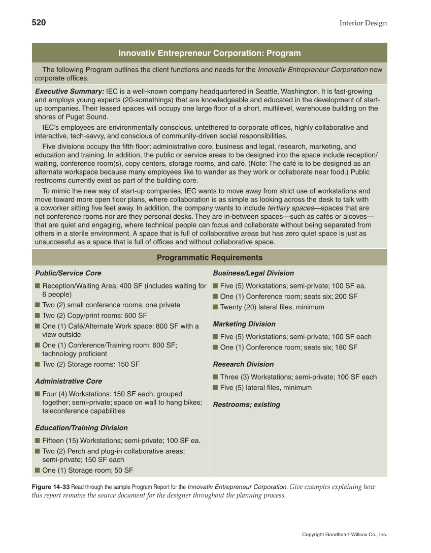 520 Interior Design Copyright Goodheart-Willcox Co., Inc. Innovativ Entrepreneur Corporation: Program The following Program outlines the client functions and needs for the Innovativ Entrepreneur Corporation new corporate offi ces. Executive Summary: IEC is a well-known company headquartered in Seattle, Washington. It is fast-growing and employs young experts (20-somethings) that are knowledgeable and educated in the development of start- up companies. Their leased spaces will occupy one large fl oor of a short, multilevel, warehouse building on the shores of Puget Sound. IEC’s employees are environmentally conscious, untethered to corporate offi ces, highly collaborative and interactive, tech-savvy, and conscious of community-driven social responsibilities. Five divisions occupy the fi fth fl oor: administrative core, business and legal, research, marketing, and education and training. In addition, the public or service areas to be designed into the space include reception/ waiting, conference room(s), copy centers, storage rooms, and café. (Note: The café is to be designed as an alternate workspace because many employees like to wander as they work or collaborate near food.) Public restrooms currently exist as part of the building core. To mimic the new way of start-up companies, IEC wants to move away from strict use of workstations and move toward more open fl oor plans, where collaboration is as simple as looking across the desk to talk with a coworker sitting fi ve feet away. In addition, the company wants to include tertiary spaces—spaces that are not conference rooms nor are they personal desks. They are in-between spaces—such as cafés or alcoves— that are quiet and engaging, where technical people can focus and collaborate without being separated from others in a sterile environment. A space that is full of collaborative areas but has zero quiet space is just as unsuccessful as a space that is full of offi ces and without collaborative space. Programmatic Requirements Public/Service Core ■ Reception/Waiting Area: 400 SF (includes waiting for 6 people) ■ Two (2) small conference rooms: one private ■ Two (2) Copy/print rooms: 600 SF ■ One (1) Café/Alternate Work space: 800 SF with a view outside ■ One (1) Conference/Training room: 600 SF technology profi cient ■ Two (2) Storage rooms: 150 SF Administrative Core ■ Four (4) Workstations: 150 SF each grouped together semi-private space on wall to hang bikes teleconference capabilities Education/Training Division ■ Fifteen (15) Workstations semi-private 100 SF ea. ■ Two (2) Perch and plug-in collaborative areas semi-private 150 SF each ■ One (1) Storage room 50 SF Business/Legal Division ■ Five (5) Workstations semi-private 100 SF ea. ■ One (1) Conference room seats six 200 SF ■ Twenty (20) lateral fi les, minimum Marketing Division ■ Five (5) Workstations semi-private 100 SF each ■ One (1) Conference room seats six 180 SF Research Division ■ Three (3) Workstations semi-private 100 SF each ■ Five (5) lateral fi les, minimum Restrooms existing Figure 14-33 Read through the sample Program Report for the Innovativ Entrepreneur Corporation. Give examples explaining how this report remains the source document for the designer throughout the planning process.