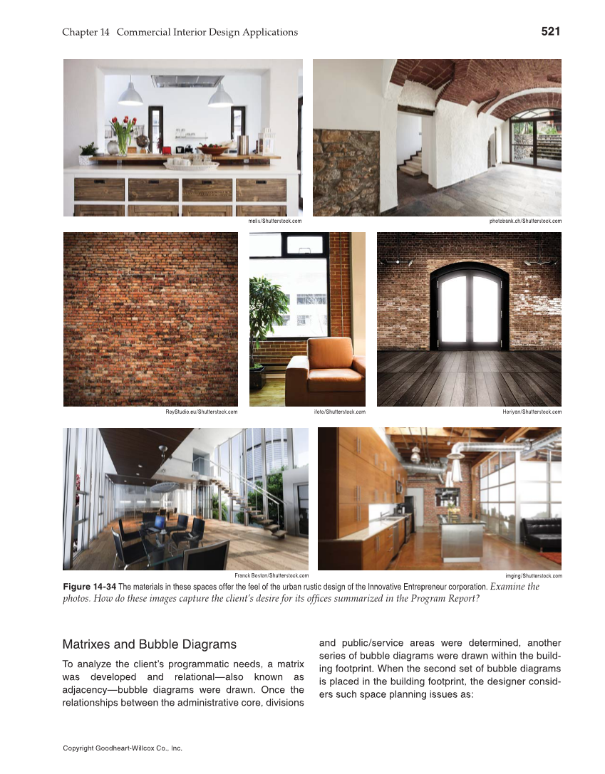 Chapter 14 Commercial Interior Design Applications 521 Copyright Goodheart-Willcox Co., Inc. Matrixes and Bubble Diagrams To analyze the client’s programmatic needs, a matrix was developed and relational—also known as adjacency—bubble diagrams were drawn. Once the relationships between the administrative core, divisions and public/service areas were determined, another series of bubble diagrams were drawn within the build- ing footprint. When the second set of bubble diagrams is placed in the building footprint, the designer consid- ers such space planning issues as: imging/Shutterstock.com Figure 14-34 The materials in these spaces offer the feel of the urban rustic design of the Innovative Entrepreneur corporation. Examine the photos. How do these images capture the client’s desire for its offi ces summarized in the Program Report? Franck Boston/Shutterstock.com Horiyan/Shutterstock.com ifoto/Shutterstock.com RoyStudio.eu/Shutterstock.com photobank.ch/Shutterstock.com melis/Shutterstock.com