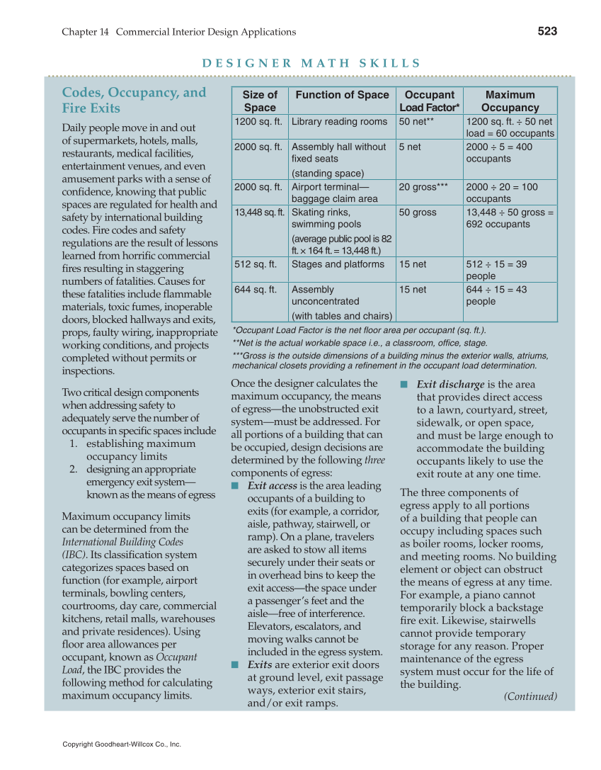 Chapter 14 Commercial Interior Design Applications 523 Copyright Goodheart-Willcox Co., Inc. D E S I G N E R M A T H S K I L L S Codes, Occupancy, and Fire Exits Daily people move in and out of supermarkets, hotels, malls, restaurants, medical facilities, entertainment venues, and even amusement parks with a sense of confidence, knowing that public spaces are regulated for health and safety by international building codes. Fire codes and safety regulations are the result of lessons learned from horrific commercial fi res resulting in staggering numbers of fatalities. Causes for these fatalities include fl ammable materials, toxic fumes, inoperable doors, blocked hallways and exits, props, faulty wiring, inappropriate working conditions, and projects completed without permits or inspections. Two critical design components when addressing safety to adequately serve the number of occupants in specific spaces include 1. establishing maximum occupancy limits 2. designing an appropriate emergency exit system— known as the means of egress Maximum occupancy limits can be determined from the International Building Codes (IBC). Its classification system categorizes spaces based on function (for example, airport terminals, bowling centers, courtrooms, day care, commercial kitchens, retail malls, warehouses and private residences). Using fl oor area allowances per occupant, known as Occupant Load, the IBC provides the following method for calculating maximum occupancy limits. Size of Space Function of Space Occupant Load Factor* Maximum Occupancy 1200 sq. ft. Library reading rooms 50 net** 1200 sq. ft. ÷ 50 net load = 60 occupants 2000 sq. ft. Assembly hall without fi xed seats (standing space) 5 net 2000 ÷ 5 = 400 occupants 2000 sq. ft. Airport terminal— baggage claim area 20 gross*** 2000 ÷ 20 = 100 occupants 13,448 sq. ft. Skating rinks, swimming pools (average public pool is 82 ft. × 164 ft. = 13,448 ft.) 50 gross 13,448 ÷ 50 gross = 692 occupants 512 sq. ft. Stages and platforms 15 net 512 ÷ 15 = 39 people 644 sq. ft. Assembly unconcentrated (with tables and chairs) 15 net 644 ÷ 15 = 43 people Once the designer calculates the maximum occupancy, the means of egress—the unobstructed exit system—must be addressed. For all portions of a building that can be occupied, design decisions are determined by the following three components of egress: ■ Exit access is the area leading occupants of a building to exits (for example, a corridor, aisle, pathway, stairwell, or ramp). On a plane, travelers are asked to stow all items securely under their seats or in overhead bins to keep the exit access—the space under a passenger’s feet and the aisle—free of interference. Elevators, escalators, and moving walks cannot be included in the egress system. ■ Exits are exterior exit doors at ground level, exit passage ways, exterior exit stairs, and/or exit ramps. ■ Exit discharge is the area that provides direct access to a lawn, courtyard, street, sidewalk, or open space, and must be large enough to accommodate the building occupants likely to use the exit route at any one time. The three components of egress apply to all portions of a building that people can occupy including spaces such as boiler rooms, locker rooms, and meeting rooms. No building element or object can obstruct the means of egress at any time. For example, a piano cannot temporarily block a backstage fi re exit. Likewise, stairwells cannot provide temporary storage for any reason. Proper maintenance of the egress system must occur for the life of the building. *Occupant Load Factor is the net fl oor area per occupant (sq. ft.). **Net is the actual workable space i.e., a classroom, offi ce, stage. ***Gross is the outside dimensions of a building minus the exterior walls, atriums, mechanical closets providing a refi nement in the occupant load determination. (Continued)