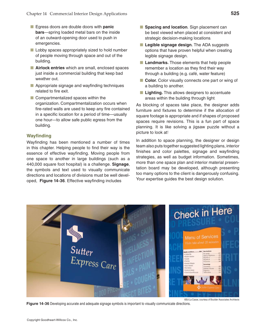 Chapter 14 Commercial Interior Design Applications 525 Copyright Goodheart-Willcox Co., Inc. ■ Egress doors are double doors with panic bars—spring loaded metal bars on the inside of an outward-opening door used to push in emergencies. ■ Lobby spaces appropriately sized to hold number of people moving through space and out of the building. ■ Airlock entries which are small, enclosed spaces just inside a commercial building that keep bad weather out. ■ Appropriate signage and wayfi nding techniques related to fi re exit. ■ Compartmentalized spaces within the organization. Compartmentalization occurs when fi re-rated walls are used to keep any fi re contained in a specific location for a period of time—usually one hour—to allow safe public egress from the building. Wayfi nding Wayfinding has been mentioned a number of times in this chapter. Helping people to fi nd their way is the essence of effective wayfi nding. Moving people from one space to another in large buildings (such as a 440,000 square foot hospital) is a challenge. Signage, the symbols and text used to visually communicate directions and locations of divisions must be well devel- oped, Figure 14-36. Effective wayfinding includes ■ Spacing and location. Sign placement can be best viewed when placed at consistent and strategic decision-making locations. ■ Legible signage design. The ADA suggests options that have proven helpful when creating legible signage design. ■ Landmarks. Those elements that help people remember a location as they fi nd their way through a building (e.g. café, water feature) ■ Color. Color visually connects one part or wing of a building to another. ■ Lighting. This allows designers to accentuate areas within the building through light. As blocking of spaces take place, the designer adds furniture and fi xtures to determine if the allocation of square footage is appropriate and if shapes of proposed spaces require revisions. This is a fun part of space planning. It is like solving a jigsaw puzzle without a picture to look at! In addition to space planning, the designer or design team also puts together suggested lighting plans, interior fi nishes and color palettes, signage and wayfi nding strategies, as well as budget information. Sometimes, more than one space plan and interior material presen- tation board may be developed, although presenting too many options to the client is dangerously confusing. Your expertise guides the best design solution. ©Ed La Casse, courtesy of Boulder Associates Architects Figure 14-36 Developing accurate and adequate signage symbols is important to visually communicate directions.