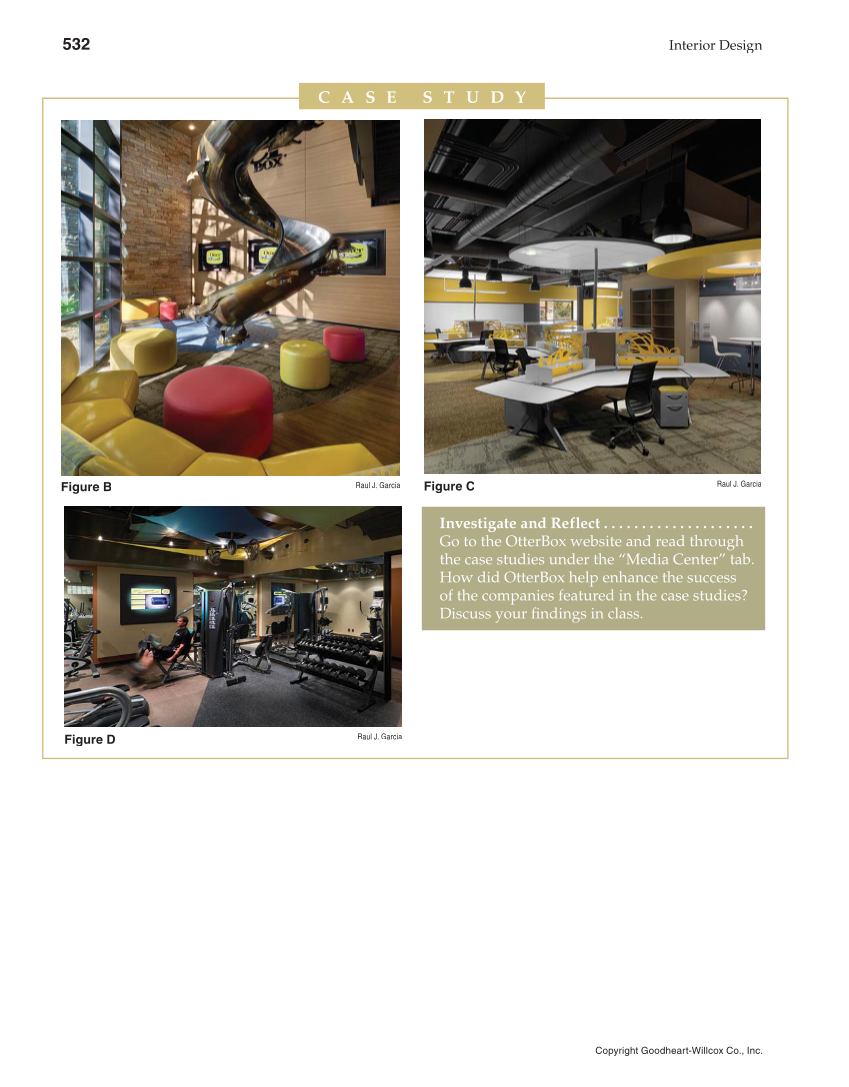 532 Interior Design Copyright Goodheart-Willcox Co., Inc. Figure C Figure D C A S E S T U D Y Investigate and Reflect . . . . . . . . . . . . . . . . . . . . Go to the OtterBox website and read through the case studies under the “Media Center” tab. How did OtterBox help enhance the success of the companies featured in the case studies? Discuss your fi ndings in class. Figure B Raul J. Garcia Raul J. Garcia Raul J. Garcia