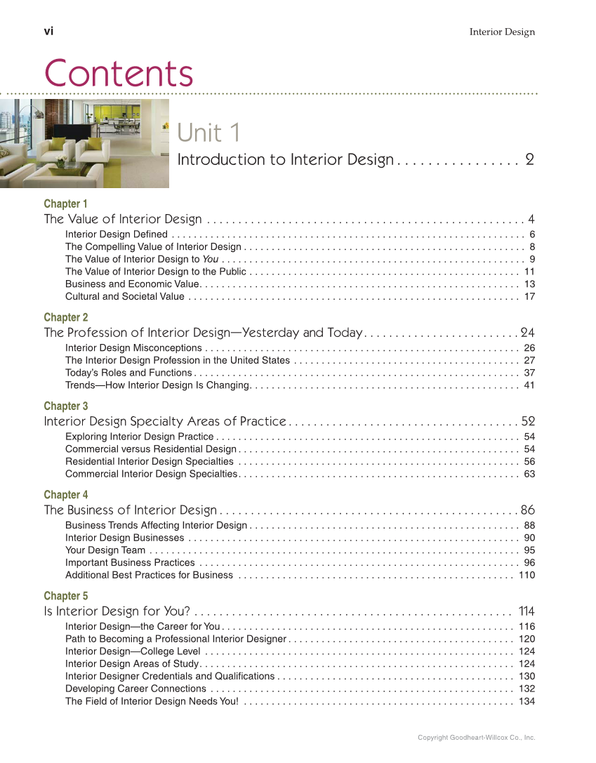 Copyright Goodheart-Willcox Co., Inc. vi Interior Design Contents Unit 1 Introduction to Interior Design . . . . . . . . . . . . . . . . 2 Chapter 1 The Value of Interior Design . . . . . . . . . . . . . . . . . . . . . . . . . . . . . . . . . . . . . . . . . . . . . . . . . . . 4 Interior Design Defi ned . . . . . . . . . . . . . . . . . . . . . . . . . . . . . . . . . . . . . . . . . . . . . . . . . . . . . . . . . . . . . . . . 6 The Compelling Value of Interior Design . . . . . . . . . . . . . . . . . . . . . . . . . . . . . . . . . . . . . . . . . . . . . . . . . . . 8 The Value of Interior Design to You . . . . . . . . . . . . . . . . . . . . . . . . . . . . . . . . . . . . . . . . . . . . . . . . . . . . . . . 9 The Value of Interior Design to the Public . . . . . . . . . . . . . . . . . . . . . . . . . . . . . . . . . . . . . . . . . . . . . . . . . 11 Business and Economic Value . . . . . . . . . . . . . . . . . . . . . . . . . . . . . . . . . . . . . . . . . . . . . . . . . . . . . . . . . . 13 Cultural and Societal Value . . . . . . . . . . . . . . . . . . . . . . . . . . . . . . . . . . . . . . . . . . . . . . . . . . . . . . . . . . . . 17 Chapter 2 The Profession of Interior Design—Yesterday and Today . . . . . . . . . . . . . . . . . . . . . . . . . 24 Interior Design Misconceptions . . . . . . . . . . . . . . . . . . . . . . . . . . . . . . . . . . . . . . . . . . . . . . . . . . . . . . . . . 26 The Interior Design Profession in the United States . . . . . . . . . . . . . . . . . . . . . . . . . . . . . . . . . . . . . . . . . 27 Today’s Roles and Functions . . . . . . . . . . . . . . . . . . . . . . . . . . . . . . . . . . . . . . . . . . . . . . . . . . . . . . . . . . . 37 Trends—How Interior Design Is Changing . . . . . . . . . . . . . . . . . . . . . . . . . . . . . . . . . . . . . . . . . . . . . . . . . 41 Chapter 3 Interior Design Specialty Areas of Practice . . . . . . . . . . . . . . . . . . . . . . . . . . . . . . . . . . . . . 52 Exploring Interior Design Practice . . . . . . . . . . . . . . . . . . . . . . . . . . . . . . . . . . . . . . . . . . . . . . . . . . . . . . . 54 Commercial versus Residential Design . . . . . . . . . . . . . . . . . . . . . . . . . . . . . . . . . . . . . . . . . . . . . . . . . . . 54 Residential Interior Design Specialties . . . . . . . . . . . . . . . . . . . . . . . . . . . . . . . . . . . . . . . . . . . . . . . . . . . 56 Commercial Interior Design Specialties . . . . . . . . . . . . . . . . . . . . . . . . . . . . . . . . . . . . . . . . . . . . . . . . . . . 63 Chapter 4 The Business of Interior Design . . . . . . . . . . . . . . . . . . . . . . . . . . . . . . . . . . . . . . . . . . . . . . . . 86 Business Trends Affecting Interior Design . . . . . . . . . . . . . . . . . . . . . . . . . . . . . . . . . . . . . . . . . . . . . . . . . 88 Interior Design Businesses . . . . . . . . . . . . . . . . . . . . . . . . . . . . . . . . . . . . . . . . . . . . . . . . . . . . . . . . . . . . 90 Your Design Team . . . . . . . . . . . . . . . . . . . . . . . . . . . . . . . . . . . . . . . . . . . . . . . . . . . . . . . . . . . . . . . . . . . 95 Important Business Practices . . . . . . . . . . . . . . . . . . . . . . . . . . . . . . . . . . . . . . . . . . . . . . . . . . . . . . . . . . 96 Additional Best Practices for Business . . . . . . . . . . . . . . . . . . . . . . . . . . . . . . . . . . . . . . . . . . . . . . . . . . 110 Chapter 5 Is Interior Design for You? . . . . . . . . . . . . . . . . . . . . . . . . . . . . . . . . . . . . . . . . . . . . . . . . . . . 114 Interior Design—the Career for You . . . . . . . . . . . . . . . . . . . . . . . . . . . . . . . . . . . . . . . . . . . . . . . . . . . . . 116 Path to Becoming a Professional Interior Designer . . . . . . . . . . . . . . . . . . . . . . . . . . . . . . . . . . . . . . . . . 120 Interior Design—College Level . . . . . . . . . . . . . . . . . . . . . . . . . . . . . . . . . . . . . . . . . . . . . . . . . . . . . . . . 124 Interior Design Areas of Study . . . . . . . . . . . . . . . . . . . . . . . . . . . . . . . . . . . . . . . . . . . . . . . . . . . . . . . . . 124 Interior Designer Credentials and Qualifi cations . . . . . . . . . . . . . . . . . . . . . . . . . . . . . . . . . . . . . . . . . . . 130 Developing Career Connections . . . . . . . . . . . . . . . . . . . . . . . . . . . . . . . . . . . . . . . . . . . . . . . . . . . . . . . 132 The Field of Interior Design Needs You! . . . . . . . . . . . . . . . . . . . . . . . . . . . . . . . . . . . . . . . . . . . . . . . . . 134