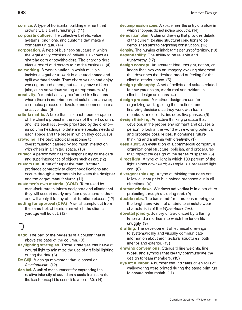 688 Interior Design Copyright Goodheart-Willcox Co., Inc. cornice. A type of horizontal building element that crowns walls and furnishings. (11) corporate culture. The collective beliefs, value systems, traditions, and customs that make a company unique. (14) corporation. A type of business structure in which the legal entity consists of individuals known as shareholders or stockholders. The shareholders elect a board of directors to run the business. (4) co-working. A work situation in which multiple individuals gather to work in a shared space and split overhead costs. They share values and enjoy working around others, but usually have different jobs, such as various young entrepreneurs. (3) creativity. A mental activity performed in situations where there is no prior correct solution or answer a complex process to develop and communicate a creative idea. (6) criteria matrix. A table that lists each room or space of the client’s project in the rows of the left column, and lists each issue—as prioritized by the client— as column headings to determine specifi c needs of each space and the order in which they occur. (6) crowding. The psychological response to overstimulation caused by too much interaction with others in a limited space. (10) curator. A person who has the responsibility for the care and superintendence of objects such as art. (12) custom run. A run of carpet the manufacturer produces separately to client specifi cations and occurs through a partnership between the designer and the carpet manufacturer. (11) customer’s own material (COM). Term used by manufacturers to inform designers and clients that they will accept nearly any fabric you send to them and will apply it to any of their furniture pieces. (12) cutting for approval (CFA). A small sample cut from the same bolt of fabric from which the client’s yardage will be cut. (12) D dado. The part of the pedestal of a column that is above the base of the column. (9) daylighting strategies. Those strategies that harvest natural light to minimize the use of artifi cial lighting during the day. (3) De Stijl. A design movement that is based on functionalism. (12) decibel. A unit of measurement for expressing the relative intensity of sound on a scale from zero (for the least-perceptible sound) to about 130. (14) decompression zone. A space near the entry of a store in which shoppers do not notice products. (14) demolition plan. A plan or drawing that provides details of the current existing structural conditions to be demolished prior to beginning construction. (16) density. The number of inhabitants per unit of territory. (10) dependability. The ability to be reliable and trustworthy. (17) design concept. An abstract idea, thought, notion, or image that involves an imagery-evoking statement that describes the desired mood or feeling for the client’s interior space. (6) design philosophy. A set of beliefs and values related to how you design, made real and evident in clients’ design solutions. (4) design process. A method designers use for organizing work, guiding their actions, and fi nalizing decisions as they work with team members and clients includes fi ve phases. (6) design thinking. An active thinking practice that develops in the proper environment and causes a person to look at the world with evolving potential and probable possibilities. It combines future thinking and analysis with creativity. (1) desk audit. An evaluation of a commercial company’s organizational structure, policies, and procedures that impact the design of the series of spaces. (6) direct light. A type of light in which 100 percent of the light shines downward example is a recessed light can. (8) divergent thinking. A type of thinking that does not follow a linear path but instead branches out in all directions. (6) dormer windows. Windows set vertically in a structure projecting through a sloping roof. (9) double rubs. The back-and-forth motions rubbing over the length and width of a fabric to simulate wear characteristic of the Wyzenbeek Test. dovetail joinery. Joinery characterized by a fl aring tenon and a mortise into which the tenon fi ts snuggly. (9) drafting. The development of technical drawings to systematically and visually communicate information about architectural structures, both interior and exterior. (13) drawing conventions. Standard line weights, line types, and symbols that clearly communicate the design to team members. (13) dye lot number. A number that indicates given rolls of wallcovering were printed during the same print run to ensure color match. (11)