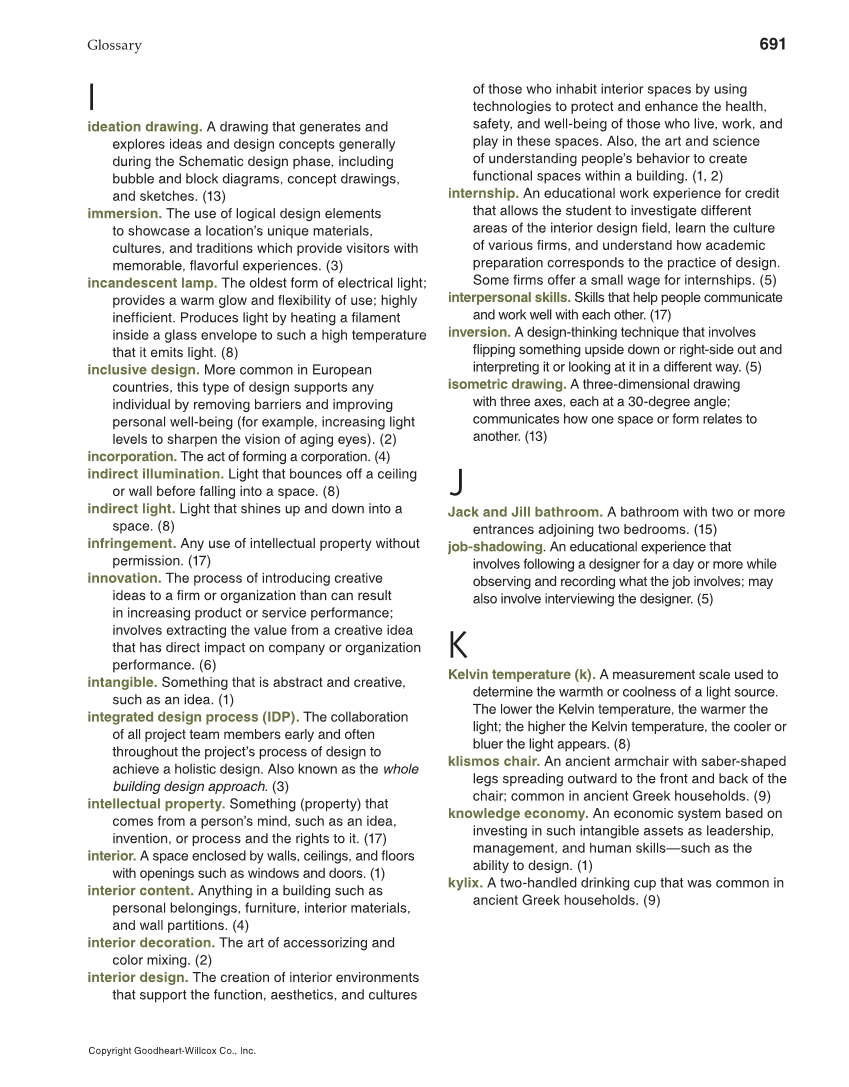 Glossary 691 Copyright Goodheart-Willcox Co., Inc. I ideation drawing. A drawing that generates and explores ideas and design concepts generally during the Schematic design phase, including bubble and block diagrams, concept drawings, and sketches. (13) immersion. The use of logical design elements to showcase a location’s unique materials, cultures, and traditions which provide visitors with memorable, fl avorful experiences. (3) incandescent lamp. The oldest form of electrical light provides a warm glow and fl exibility of use highly ineffi cient. Produces light by heating a fi lament inside a glass envelope to such a high temperature that it emits light. (8) inclusive design. More common in European countries, this type of design supports any individual by removing barriers and improving personal well-being (for example, increasing light levels to sharpen the vision of aging eyes). (2) incorporation. The act of forming a corporation. (4) indirect illumination. Light that bounces off a ceiling or wall before falling into a space. (8) indirect light. Light that shines up and down into a space. (8) infringement. Any use of intellectual property without permission. (17) innovation. The process of introducing creative ideas to a fi rm or organization than can result in increasing product or service performance involves extracting the value from a creative idea that has direct impact on company or organization performance. (6) intangible. Something that is abstract and creative, such as an idea. (1) integrated design process (IDP). The collaboration of all project team members early and often throughout the project’s process of design to achieve a holistic design. Also known as the whole building design approach. (3) intellectual property. Something (property) that comes from a person’s mind, such as an idea, invention, or process and the rights to it. (17) interior. A space enclosed by walls, ceilings, and fl oors with openings such as windows and doors. (1) interior content. Anything in a building such as personal belongings, furniture, interior materials, and wall partitions. (4) interior decoration. The art of accessorizing and color mixing. (2) interior design. The creation of interior environments that support the function, aesthetics, and cultures of those who inhabit interior spaces by using technologies to protect and enhance the health, safety, and well-being of those who live, work, and play in these spaces. Also, the art and science of understanding people’s behavior to create functional spaces within a building. (1, 2) internship. An educational work experience for credit that allows the student to investigate different areas of the interior design fi eld, learn the culture of various fi rms, and understand how academic preparation corresponds to the practice of design. Some fi rms offer a small wage for internships. (5) interpersonal skills. Skills that help people communicate and work well with each other. (17) inversion. A design-thinking technique that involves fl ipping something upside down or right-side out and interpreting it or looking at it in a different way. (5) isometric drawing. A three-dimensional drawing with three axes, each at a 30-degree angle communicates how one space or form relates to another. (13) J Jack and Jill bathroom. A bathroom with two or more entrances adjoining two bedrooms. (15) job-shadowing. An educational experience that involves following a designer for a day or more while observing and recording what the job involves may also involve interviewing the designer. (5) K Kelvin temperature (k). A measurement scale used to determine the warmth or coolness of a light source. The lower the Kelvin temperature, the warmer the light the higher the Kelvin temperature, the cooler or bluer the light appears. (8) klismos chair. An ancient armchair with saber-shaped legs spreading outward to the front and back of the chair common in ancient Greek households. (9) knowledge economy. An economic system based on investing in such intangible assets as leadership, management, and human skills—such as the ability to design. (1) kylix. A two-handled drinking cup that was common in ancient Greek households. (9)