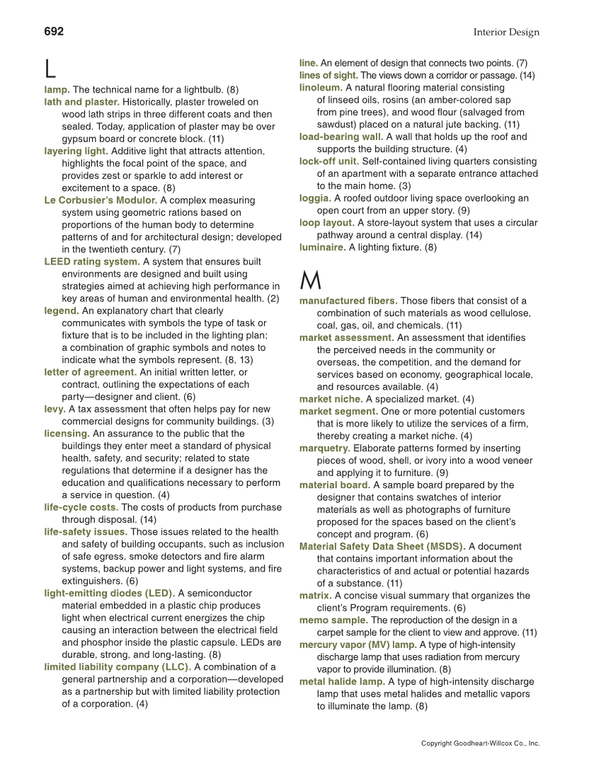 692 Interior Design Copyright Goodheart-Willcox Co., Inc. L lamp. The technical name for a lightbulb. (8) lath and plaster. Historically, plaster troweled on wood lath strips in three different coats and then sealed. Today, application of plaster may be over gypsum board or concrete block. (11) layering light. Additive light that attracts attention, highlights the focal point of the space, and provides zest or sparkle to add interest or excitement to a space. (8) Le Corbusier’s Modulor. A complex measuring system using geometric rations based on proportions of the human body to determine patterns of and for architectural design developed in the twentieth century. (7) LEED rating system. A system that ensures built environments are designed and built using strategies aimed at achieving high performance in key areas of human and environmental health. (2) legend. An explanatory chart that clearly communicates with symbols the type of task or fi xture that is to be included in the lighting plan a combination of graphic symbols and notes to indicate what the symbols represent. (8, 13) letter of agreement. An initial written letter, or contract, outlining the expectations of each party—designer and client. (6) levy. A tax assessment that often helps pay for new commercial designs for community buildings. (3) licensing. An assurance to the public that the buildings they enter meet a standard of physical health, safety, and security related to state regulations that determine if a designer has the education and qualifi cations necessary to perform a service in question. (4) life-cycle costs. The costs of products from purchase through disposal. (14) life-safety issues. Those issues related to the health and safety of building occupants, such as inclusion of safe egress, smoke detectors and fi re alarm systems, backup power and light systems, and fi re extinguishers. (6) light-emitting diodes (LED). A semiconductor material embedded in a plastic chip produces light when electrical current energizes the chip causing an interaction between the electrical fi eld and phosphor inside the plastic capsule. LEDs are durable, strong, and long-lasting. (8) limited liability company (LLC). A combination of a general partnership and a corporation—developed as a partnership but with limited liability protection of a corporation. (4) line. An element of design that connects two points. (7) lines of sight. The views down a corridor or passage. (14) linoleum. A natural fl ooring material consisting of linseed oils, rosins (an amber-colored sap from pine trees), and wood fl our (salvaged from sawdust) placed on a natural jute backing. (11) load-bearing wall. A wall that holds up the roof and supports the building structure. (4) lock-off unit. Self-contained living quarters consisting of an apartment with a separate entrance attached to the main home. (3) loggia. A roofed outdoor living space overlooking an open court from an upper story. (9) loop layout. A store-layout system that uses a circular pathway around a central display. (14) luminaire. A lighting fi xture. (8) M manufactured fi bers. Those fi bers that consist of a combination of such materials as wood cellulose, coal, gas, oil, and chemicals. (11) market assessment. An assessment that identifi es the perceived needs in the community or overseas, the competition, and the demand for services based on economy, geographical locale, and resources available. (4) market niche. A specialized market. (4) market segment. One or more potential customers that is more likely to utilize the services of a fi rm, thereby creating a market niche. (4) marquetry. Elaborate patterns formed by inserting pieces of wood, shell, or ivory into a wood veneer and applying it to furniture. (9) material board. A sample board prepared by the designer that contains swatches of interior materials as well as photographs of furniture proposed for the spaces based on the client’s concept and program. (6) Material Safety Data Sheet (MSDS). A document that contains important information about the characteristics of and actual or potential hazards of a substance. (11) matrix. A concise visual summary that organizes the client’s Program requirements. (6) memo sample. The reproduction of the design in a carpet sample for the client to view and approve. (11) mercury vapor (MV) lamp. A type of high-intensity discharge lamp that uses radiation from mercury vapor to provide illumination. (8) metal halide lamp. A type of high-intensity discharge lamp that uses metal halides and metallic vapors to illuminate the lamp. (8)