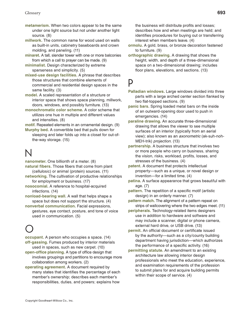 Glossary 693 Copyright Goodheart-Willcox Co., Inc. metamerism. When two colors appear to be the same under one light source but not under another light source. (8) millwork. The common name for wood used on walls as built-in units, cabinetry baseboards and crown molding, and paneling. (11) minaret. A tall, slender tower with one or more balconies from which a call to prayer can be made. (9) minimalist. Design characterized by extreme sparseness and simplicity. (5) mixed-use design facilities. A phrase that describes those structures that combine elements of commercial and residential design spaces in the same facility. (3) model. A scaled representation of a structure or interior space that shows space planning, millwork, doors, windows, and possibly furniture. (13) monochromatic color scheme. A color scheme that utilizes one hue in multiple and different values and intensities. (8) motif. Repeated elements in an ornamental design. (9) Murphy bed. A convertible bed that pulls down for sleeping and later folds up into a closet for out-of- the-way storage. (15) N nanometer. One billionth of a meter. (8) natural fi bers. Those fi bers that come from plant (cellulosic) or animal (protein) sources. (11) networking. The cultivation of productive relationships for employment or business. (17) nosocomial. A reference to hospital-acquired infections. (14) nonload-bearing wall. A wall that helps shape a space but does not support the structure. (4) nonverbal communication. Facial expressions, gestures, eye contact, posture, and tone of voice used in communication. (5) O occupant. A person who occupies a space. (14) off-gassing. Fumes produced by interior materials used in spaces, such as new carpet. (10) open-offi ce planning. A type of offi ce design that involves groupings and partitions to encourage more collaboration among workers. (2) operating agreement. A document required by many states that identifi es the percentage of each member’s ownership describes each member’s responsibilities, duties, and powers explains how the business will distribute profi ts and losses describes how and when meetings are held and identifi es procedures for buying out or transferring interest when members leave. (4) ormolu. A gold, brass, or bronze decoration fastened to furniture. (9) orthographic drawing. A drawing that shows the height, width, and depth of a three-dimensional space on a two-dimensional drawing includes fl oor plans, elevations, and sections. (13) P Palladian windows. Large windows divided into three parts with a large arched center section fl anked by two fl at-topped sections. (9) panic bars. Spring loaded metal bars on the inside of an outward-opening door used to push in emergencies. (14) paraline drawing. An accurate three-dimensional drawing that allows the viewer to see multiple surfaces of an interior (typically from an aerial view) also known as an axonometric (ak-suh-noh- MEH-trik) projection. (13) partnership. A business structure that involves two or more people who carry on business, sharing the vision, risks, workload, profi ts, losses, and stresses of the business. (4) patent. A document that protects intellectual property—such as a unique, or novel design or invention—for a limited time. (4) patina. A surface appearance that grows beautiful with age. (7) pattern. The repetition of a specifi c motif (artistic design) in an orderly manner. (7) pattern match. The alignment of a pattern repeat on strips of wallcovering where the two edges meet. (11) peripherals. Technology-related items designers use in addition to hardware and software and may include a scanner, digital or phone camera, external hard drive, or USB drive. (13) permit. An offi cial document or certifi cate issued by the authority—such as a city/county building department having jurisdiction—which authorizes the performance of a specifi c activity. (16) permitting statute. An amendment to an existing architecture law allowing interior design professionals who meet the education, experience, and examination requirements of the profession to submit plans for and acquire building permits within their scope of service. (4)