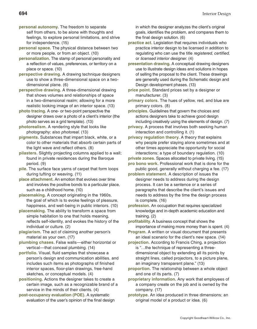 694 Interior Design Copyright Goodheart-Willcox Co., Inc. personal autonomy. The freedom to separate self from others, to be alone with thoughts and feelings, to explore personal limitations, and strive for independence. (15) personal space. The physical distance between two or more people, or from an object. (10) personalization. The stamp of personal personality and a refl ection of values, preferences, or territory on a place or space. (10) perspective drawing. A drawing technique designers use to show a three-dimensional space on a two- dimensional plane. (6) perspective drawing. A three-dimensional drawing that shows volumes and relationships of space in a two-dimensional realm allowing for a more realistic looking image of an interior space. (13) photo tracing. A one- or two-point perspective the designer draws over a photo of a client’s interior (the photo serves as a grid template). (13) photorealism. A rendering style that looks like photography also photoreal. (13) pigments. Substances that impart black, white, or a color to other materials that absorb certain parts of the light wave and refl ect others. (8) pilasters. Slightly projecting columns applied to a wall found in private residences during the Baroque period. (9) pile. The surface face yarns of carpet that form loops during tufting or weaving. (11) place attachment. An emotion that evolves over time and involves the positive bonds to a particular place, such as a childhood home. (10) placemaking. A concept originating in the 1960s, the goal of which is to evoke feelings of pleasure, happiness, and well-being in public interiors. (10) placemaking. The ability to transform a space from simple habitation to one that holds meaning, refl ects self-identity, and evokes the history of the individual or culture. (2) plagiarism. The act of claiming another person’s material as your own. (17) plumbing chases. False walls—either horizontal or vertical—that conceal plumbing. (14) portfolio. Visual, fl uid samples that showcase a person’s design and communication abilities, and includes such items as photographs of fi nished interior spaces, fl oor-plan drawings, free-hand sketches, or conceptual models. (4) positioning. Actions the designer takes to create a certain image, such as a recognizable brand of a service in the minds of their clients. (4) post-occupancy evaluation (POE). A systematic evaluation of the user’s opinion of the fi nal design in which the designer analyzes the client’s original goals, identifi es the problem, and compares them to the fi nal design solution. (6) practice act. Legislation that requires individuals who practice interior design to be licensed in addition to regulating who can use the title registered, certifi ed, or licensed interior designer. (4) presentation drawing. A conceptual drawing designers use to illustrate design ideas and solutions in hopes of selling the proposal to the client. These drawings are generally used during the Schematic design and Design development phases. (13) price point. Standard prices set by a designer or manufacturer. (3) primary colors. The hues of yellow, red, and blue are primary colors. (8) principles. Guidelines that govern the choices and actions designers take to achieve good design including creatively using the elements of design. (7) privacy. A process that involves both seeking human interaction and controlling it. (1) privacy regulation theory. A theory that explains why people prefer staying alone sometimes and at other times appreciate the opportunity for social interactions a type of boundary regulation. (10) private zones. Spaces allocated to private living. (15) pro bono work. Professional work that is done for the public good, generally without charging a fee. (17) problem statement. A description of issues the designer needs to address during the design process. It can be a sentence or a series of paragraphs that describe the client’s issues and needs to address by the time the design process is complete. (16) profession. An occupation that requires specialized knowledge and in-depth academic education and training. (2) profi tability. A business concept that shows the importance of making more money than is spent. (4) Program. A written or visual document that presents an ideal scenario for the client’s new space. (14) projection. According to Francis Ching, a projection is “…the technique of representing a three- dimensional object by extending all its points by straight lines, called projectors, to a picture plane, an imaginary transparent plane.” (13) proportion. The relationship between a whole object and one of its parts. (7) proprietary information. Any work that employees of a company create on the job and is owned by the company. (17) prototype. An idea produced in three dimensions an original model of a product or idea. (6)