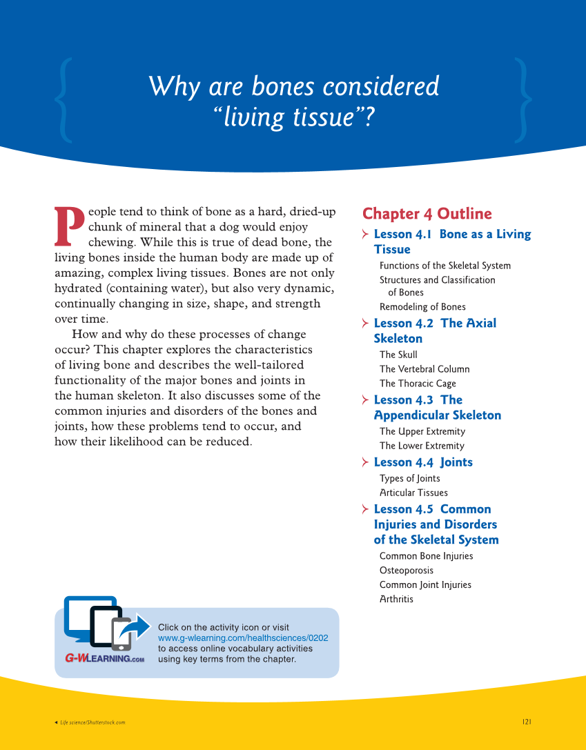 121 Life science/Shutterstock.com Why are bones considered “living tissue”? Click on the activity icon or visit www.g-wlearning.com/healthsciences/0202 to access online vocabulary activities using key terms from the chapter. P eople tend to think of bone as a hard, dried-up chunk of mineral that a dog would enjoy chewing. While this is true of dead bone, the living bones inside the human body are made up of amazing, complex living tissues. Bones are not only hydrated (containing water), but also very dynamic, continually changing in size, shape, and strength over time. How and why do these processes of change occur? This chapter explores the characteristics of living bone and describes the well-tailored functionality of the major bones and joints in the human skeleton. It also discusses some of the common injuries and disorders of the bones and joints, how these problems tend to occur, and how their likelihood can be reduced. Chapter 4 Outline Lesson 4.1 Bone as a Living Tissue Functions of the Skeletal System Structures and Classification of Bones Remodeling of Bones Lesson 4.2 The Axial Skeleton The Skull The Vertebral Column The Thoracic Cage Lesson 4.3 The Appendicular Skeleton The Upper Extremity The Lower Extremity Lesson 4.4 Joints Types of Joints Articular Tissues Lesson 4.5 Common Injuries and Disorders of the Skeletal System Common Bone Injuries Osteoporosis Common Joint Injuries Arthritis