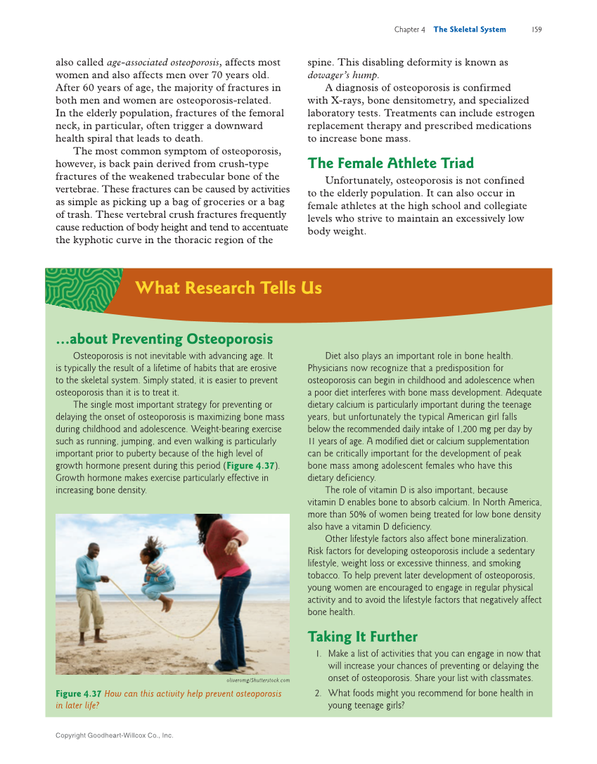 Chapter 4 The Skeletal System 159 spine. This disabling deformity is known as dowager’s hump. A diagnosis of osteoporosis is confirmed with X-rays, bone densitometry, and specialized laboratory tests. Treatments can include estrogen replacement therapy and prescribed medications to increase bone mass. The Female Athlete Triad Unfortunately, osteoporosis is not confined to the elderly population. It can also occur in female athletes at the high school and collegiate levels who strive to maintain an excessively low body weight. also called age-associated osteoporosis, affects most women and also affects men over 70 years old. After 60 years of age, the majority of fractures in both men and women are osteoporosis-related. In the elderly population, fractures of the femoral neck, in particular, often trigger a downward health spiral that leads to death. The most common symptom of osteoporosis, however, is back pain derived from crush-type fractures of the weakened trabecular bone of the vertebrae. These fractures can be caused by activities as simple as picking up a bag of groceries or a bag of trash. These vertebral crush fractures frequently cause reduction of body height and tend to accentuate the kyphotic curve in the thoracic region of the What Research Tells Us …about Preventing Osteoporosis Osteoporosis is not inevitable with advancing age. It is typically the result of a lifetime of habits that are erosive to the skeletal system. Simply stated, it is easier to prevent osteoporosis than it is to treat it. The single most important strategy for preventing or delaying the onset of osteoporosis is maximizing bone mass during childhood and adolescence. Weight-bearing exercise such as running, jumping, and even walking is particularly important prior to puberty because of the high level of growth hormone present during this period (Figure 4.37). Growth hormone makes exercise particularly effective in increasing bone density. Diet also plays an important role in bone health. Physicians now recognize that a predisposition for osteoporosis can begin in childhood and adolescence when a poor diet interferes with bone mass development. Adequate dietary calcium is particularly important during the teenage years, but unfortunately the typical American girl falls below the recommended daily intake of 1,200 mg per day by 11 years of age. A modified diet or calcium supplementation can be critically important for the development of peak bone mass among adolescent females who have this dietary deficiency. The role of vitamin D is also important, because vitamin D enables bone to absorb calcium. In North America, more than 50% of women being treated for low bone density also have a vitamin D deficiency. Other lifestyle factors also affect bone mineralization. Risk factors for developing osteoporosis include a sedentary lifestyle, weight loss or excessive thinness, and smoking tobacco. To help prevent later development of osteoporosis, young women are encouraged to engage in regular physical activity and to avoid the lifestyle factors that negatively affect bone health. Taking It Further 1. Make a list of activities that you can engage in now that will increase your chances of preventing or delaying the onset of osteoporosis. Share your list with classmates. 2. What foods might you recommend for bone health in young teenage girls? oliveromg/Shutterstock.com Figure 4.37 How can this activity help prevent osteoporosis in later life? Copyright Goodheart-Willcox Co., Inc.