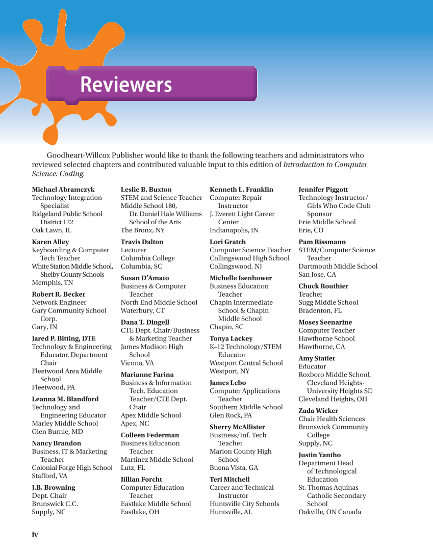 Michael Abramczyk Technology Integration Specialist Ridgeland Public School District 122 Oak Lawn, IL Karen Alley Keyboarding & Computer Tech Teacher White Station Middle School, Shelby County Schools Memphis, TN Robert R. Becker Network Engineer Gary Community School Corp. Gary, IN Jared P. Bitting, DTE Technology & Engineering Educator, Department Chair Fleetwood Area Middle School Fleetwood, PA Leanna M. Blandford Technology and Engineering Educator Marley Middle School Glen Burnie, MD Nancy Brandon Business, IT & Marketing Teacher Colonial Forge High School Stafford, VA J.B. Browning Dept. Chair Brunswick C.C. Supply, NC Leslie B. Buxton STEM and Science Teacher Middle School 180, Dr. Daniel Hale Williams School of the Arts The Bronx, NY Travis Dalton Lecturer Columbia College Columbia, SC Susan D’Amato Business & Computer Business & Computer Teacher North End Middle School Waterbury, CT Dana T. Dingell CTE Dept. Chair/Business & Marketing Teacher James Madison High School Vienna, VA Marianne Farina Business & Information Tech. Education Teacher/CTE Dept. Chair Apex Middle School Apex, NC Colleen Federman Business Education Teacher Martinez Middle School Lutz, FL Jillian Forcht Computer Education Teacher Eastlake Middle School Eastlake, OH Kenneth L. Franklin Computer Repair Instructor J. Everett Light Career Center Indianapolis, IN Lori Gratch Computer Science Teacher Collingswood High School Collingswood, NJ Michelle Isenhower Business Education Business Education Teacher Chapin Intermediate School & Chapin Middle School Chapin, SC Tonya Lackey K–12 Technology/STEM Educator Westport Central School Westport, NY James Lebo Computer Applications Teacher Southern Middle School Glen Rock, PA Sherry McAllister Business/Inf. Tech Teacher Marion County High School Buena Vista, GA Teri Mitchell Career and Technical Instructor Huntsville City Schools Huntsville, AL Jennifer Piggott Technology Instructor/ Girls Who Code Club Sponsor Erie Middle School Erie, CO Pam Rissmann STEM/Computer Science Teacher Dartmouth Middle School San Jose, CA Chuck Routhiererhiut Chuck Ro Teacher Sugg Middle School Bradenton, FL Moses Seenarine Computer Teacher Hawthorne School Hawthorne, CA Amy Statler Educator Roxboro Middle School, Cleveland Heights- University Heights SD Cleveland Heights, OH Zada Wicker Chair Health Sciences Brunswick Community College Supply, NC Justin Yantho Department Head of Technological Education St. Thomas Aquinas Catholic Secondary School Oakville, ON Canada Reviewers Goodheart-Willcox Publisher would like to thank the following teachers and administrators who reviewed selected chapters and contributed valuable input to this edition of Introduction to Computer Science: Coding. iv